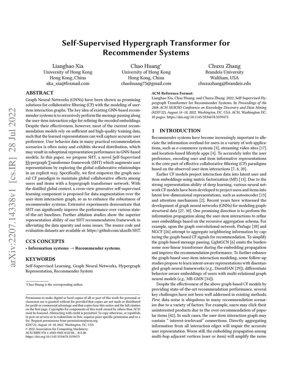 Self-Supervised Hypergraph Transformer for Recommender Systems