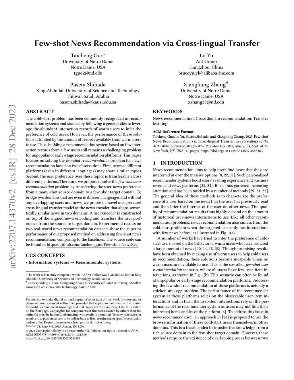 The cold-start problem has been commonly recognized in recommendation systems and studied by following a general idea to leverage the abundant interaction records of warm users to infer the preference of cold users. However, the performance of these solutions is limited by the amount of records available from warm users to use. Thus, building a recommendation system based on few interaction records from a few users still remains a challenging problem for unpopular or early-stage recommendation platforms. This paper focuses on solving the few-shot recommendation problem for news recommendation based on two observations. First, news at different platforms (even in different languages) may share similar topics. Second, the user preference over these topics is transferable across different platforms. Therefore, we propose to solve the few-shot news recommendation problem by transferring the user-news preference from a many-shot source domain to a few-shot target domain. To bridge two domains that are even in different languages and without any overlapping users and news, we propose a novel unsupervised cross-lingual transfer model as the news encoder that aligns semantically similar news in two domains. A user encoder is constructed on top of the aligned news encoding and transfers the user preference from the source to target domain. Experimental results on two real-world news recommendation datasets show the superior performance of our proposed method on addressing few-shot news recommendation, comparing to the baselines.