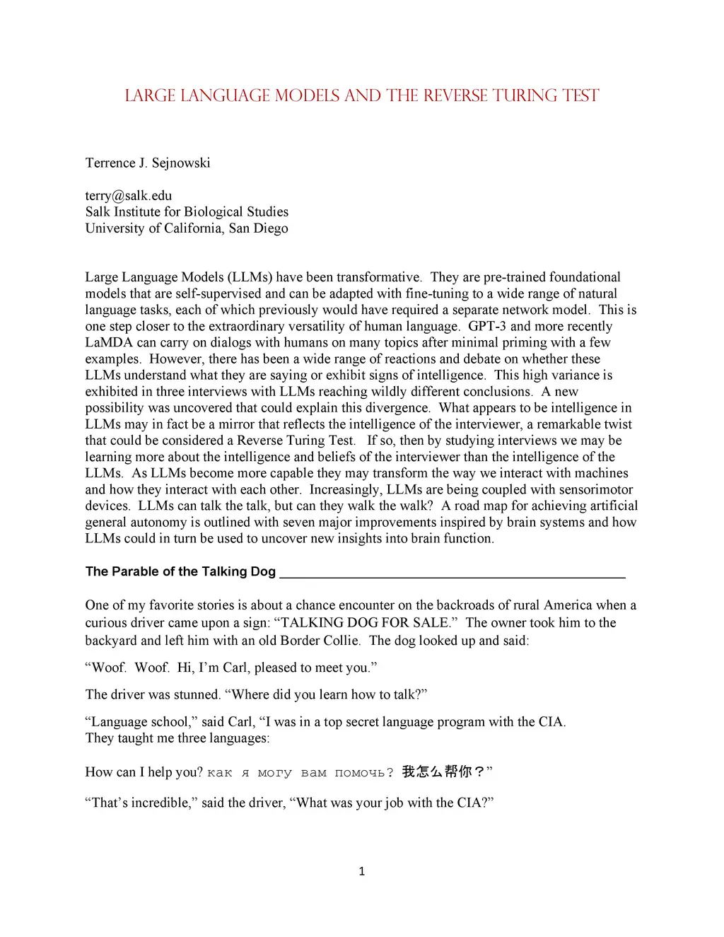 Large Language Models (LLMs) have been transformative. They are pre-trained foundational models that are self-supervised and can be adapted with fine tuning to a wide range of natural language tasks, each of which previously would have required a separate network model. This is one step closer to the extraordinary versatility of human language. GPT-3 and more recently LaMDA can carry on dialogs with humans on many topics after minimal priming with a few examples. However, there has been a wide range of reactions and debate on whether these LLMs understand what they are saying or exhibit signs of intelligence. This high variance is exhibited in three interviews with LLMs reaching wildly different conclusions. A new possibility was uncovered that could explain this divergence. What appears to be intelligence in LLMs may in fact be a mirror that reflects the intelligence of the interviewer, a remarkable twist that could be considered a Reverse Turing Test. If so, then by studying interviews we may be learning more about the intelligence and beliefs of the interviewer than the intelligence of the LLMs. As LLMs become more capable they may transform the way we interact with machines and how they interact with each other. Increasingly, LLMs are being coupled with sensorimotor devices. LLMs can talk the talk, but can they walk the walk? A road map for achieving artificial general autonomy is outlined with seven major improvements inspired by brain systems. LLMs could be used to uncover new insights into brain function by downloading brain data during natural behaviors.