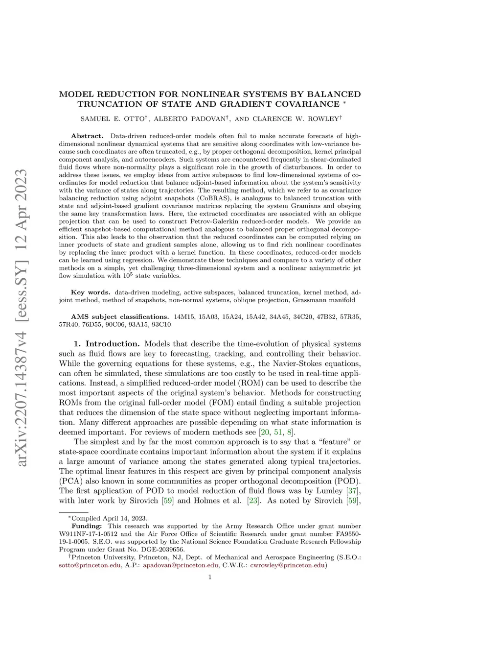 Data-driven reduced-order models often fail to make accurate forecasts of high-dimensional nonlinear dynamical systems that are sensitive along coordinates with low-variance because such coordinates are often truncated, e.g., by proper orthogonal decomposition, kernel principal component analysis, and autoencoders. Such systems are encountered frequently in shear-dominated fluid flows where non-normality plays a significant role in the growth of disturbances. In order to address these issues, we employ ideas from active subspaces to find low-dimensional systems of coordinates for model reduction that balance adjoint-based information about the system's sensitivity with the variance of states along trajectories. The resulting method, which we refer to as covariance balancing reduction using adjoint snapshots (CoBRAS), is analogous to balanced truncation with state and adjoint-based gradient covariance matrices replacing the system Gramians and obeying the same key transformation laws. Here, the extracted coordinates are associated with an oblique projection that can be used to construct Petrov-Galerkin reduced-order models. We provide an efficient snapshot-based computational method analogous to balanced proper orthogonal decomposition. This also leads to the observation that the reduced coordinates can be computed relying on inner products of state and gradient samples alone, allowing us to find rich nonlinear coordinates by replacing the inner product with a kernel function. In these coordinates, reduced-order models can be learned using regression. We demonstrate these techniques and compare to a variety of other methods on a simple, yet challenging three-dimensional system and a nonlinear axisymmetric jet flow simulation with state variables.