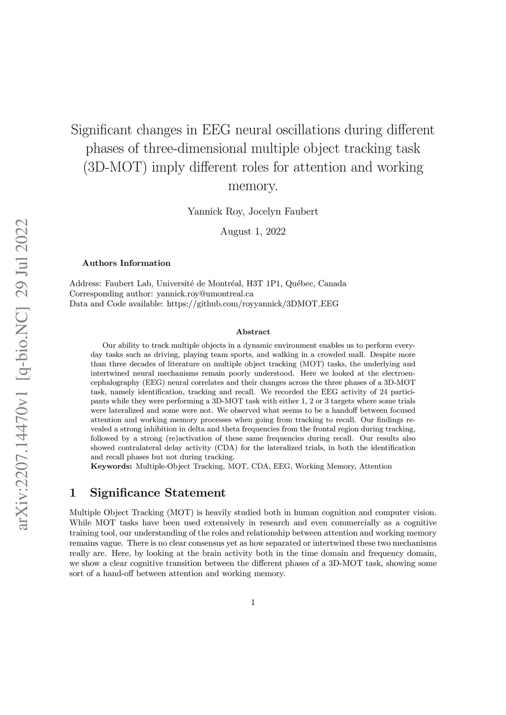 Our ability to track multiple objects in a dynamic environment enables us to perform everyday tasks such as driving, playing team sports, and walking in a crowded mall. Despite more than three decades of literature on multiple object tracking (MOT) tasks, the underlying and intertwined neural mechanisms remain poorly understood. Here we looked at the electroencephalography (EEG) neural correlates and their changes across the three phases of a 3D-MOT task, namely identification, tracking and recall. We recorded the EEG activity of 24 participants while they were performing a 3D-MOT task with either 1, 2 or 3 targets where some trials were lateralized and some were not. We observed what seems to be a handoff between focused attention and working memory processes when going from tracking to recall. Our findings revealed a strong inhibition in delta and theta frequencies from the frontal region during tracking, followed by a strong (re)activation of these same frequencies during recall. Our results also showed contralateral delay activity (CDA) for the lateralized trials, in both the identification and recall phases but not during tracking.