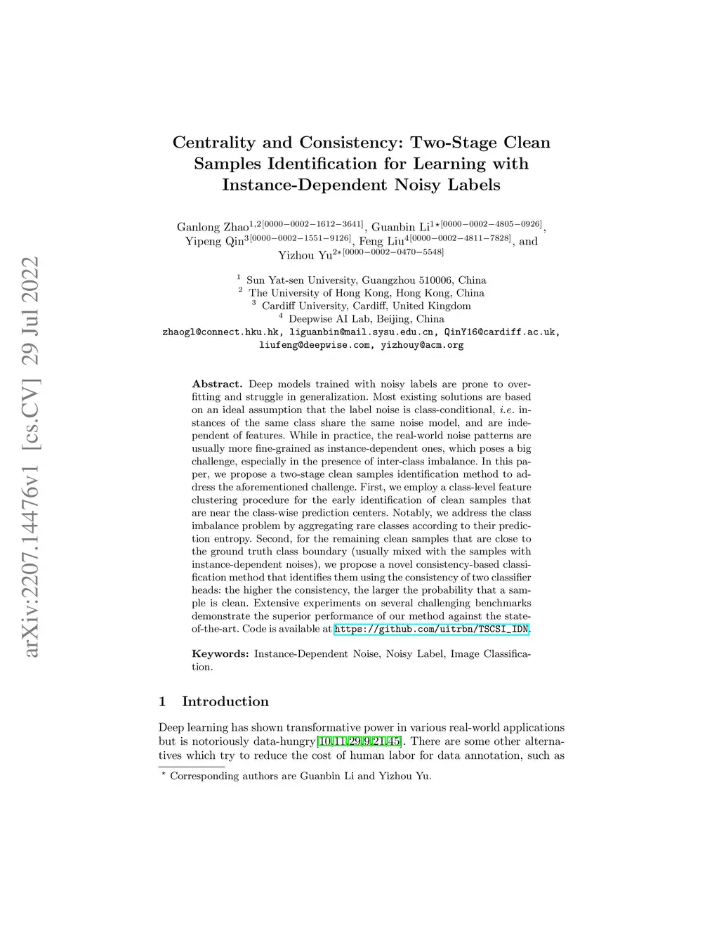 Centrality and Consistency: Two-Stage Clean Samples Identification for