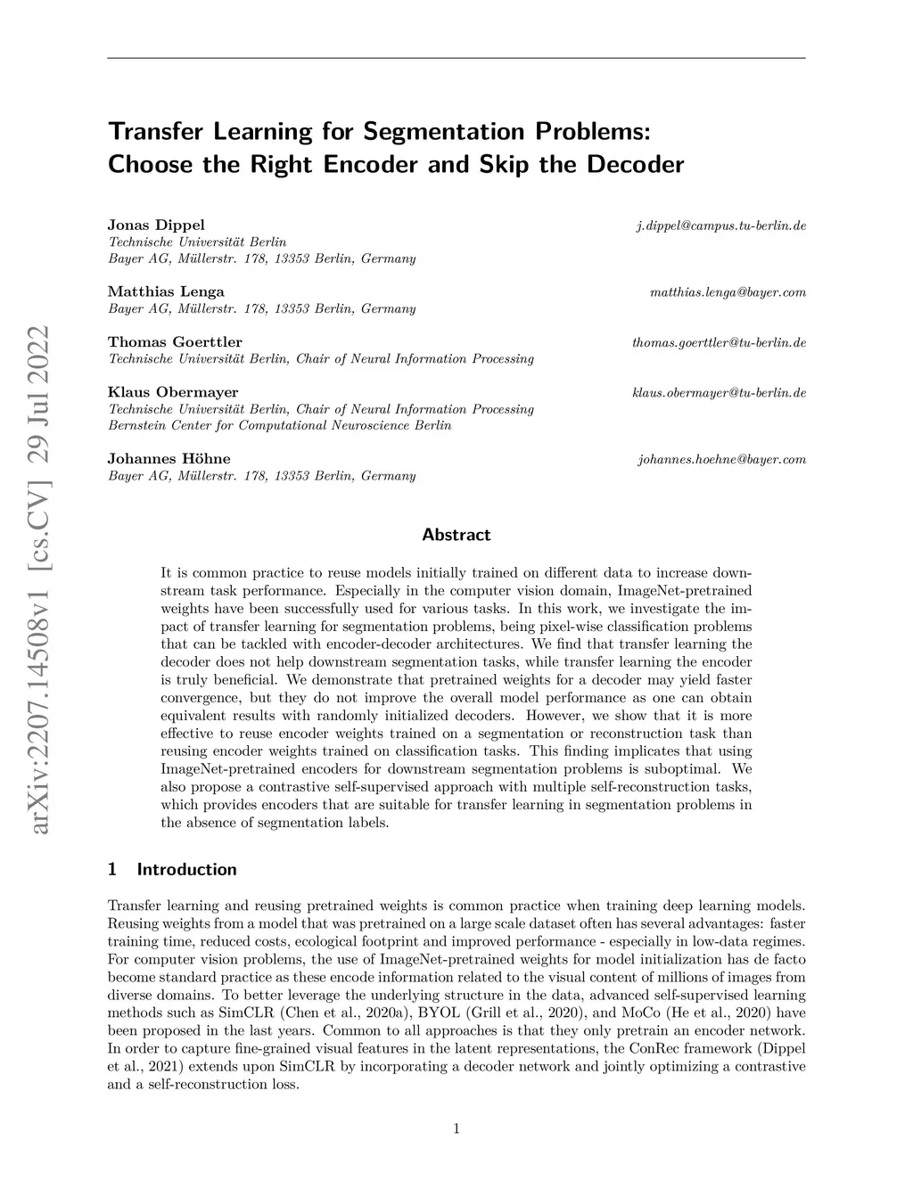 It is common practice to reuse models initially trained on different data to increase downstream task performance. Especially in the computer vision domain, ImageNet-pretrained weights have been successfully used for various tasks. In this work, we investigate the impact of transfer learning for segmentation problems, being pixel-wise classification problems that can be tackled with encoder-decoder architectures. We find that transfer learning the decoder does not help downstream segmentation tasks, while transfer learning the encoder is truly beneficial. We demonstrate that pretrained weights for a decoder may yield faster convergence, but they do not improve the overall model performance as one can obtain equivalent results with randomly initialized decoders. However, we show that it is more effective to reuse encoder weights trained on a segmentation or reconstruction task than reusing encoder weights trained on classification tasks. This finding implicates that using ImageNet-pretrained encoders for downstream segmentation problems is suboptimal. We also propose a contrastive self-supervised approach with multiple self-reconstruction tasks, which provides encoders that are suitable for transfer learning in segmentation problems in the absence of segmentation labels.
