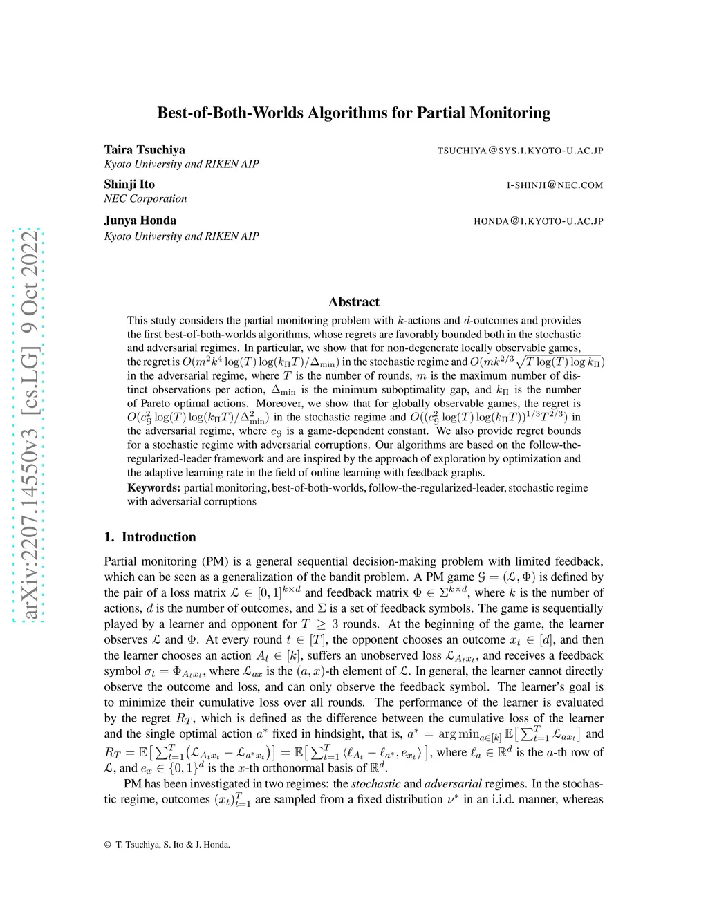 This paper considers the partial monitoring problem with -actions and -outcomes and provides the first best-of-both-worlds algorithms, whose regrets are bounded poly-logarithmically in the stochastic regime and near-optimally in the adversarial regime. To be more specific, we show that for non-degenerate locally observable games, the regret in the stochastic regime is bounded by and in the adversarial regime by , where is the number of rounds, is the maximum number of distinct observations per action, is the minimum optimality gap, and is the number of Pareto optimal actions. Moreover, we show that for non-degenerate globally observable games, the regret in the stochastic regime is bounded by and in the adversarial regime by , where is a game-dependent constant. Our algorithms are based on the follow-the-regularized-leader framework that takes into account the nature of the partial monitoring problem, inspired by algorithms in the field of online learning with feedback graphs.