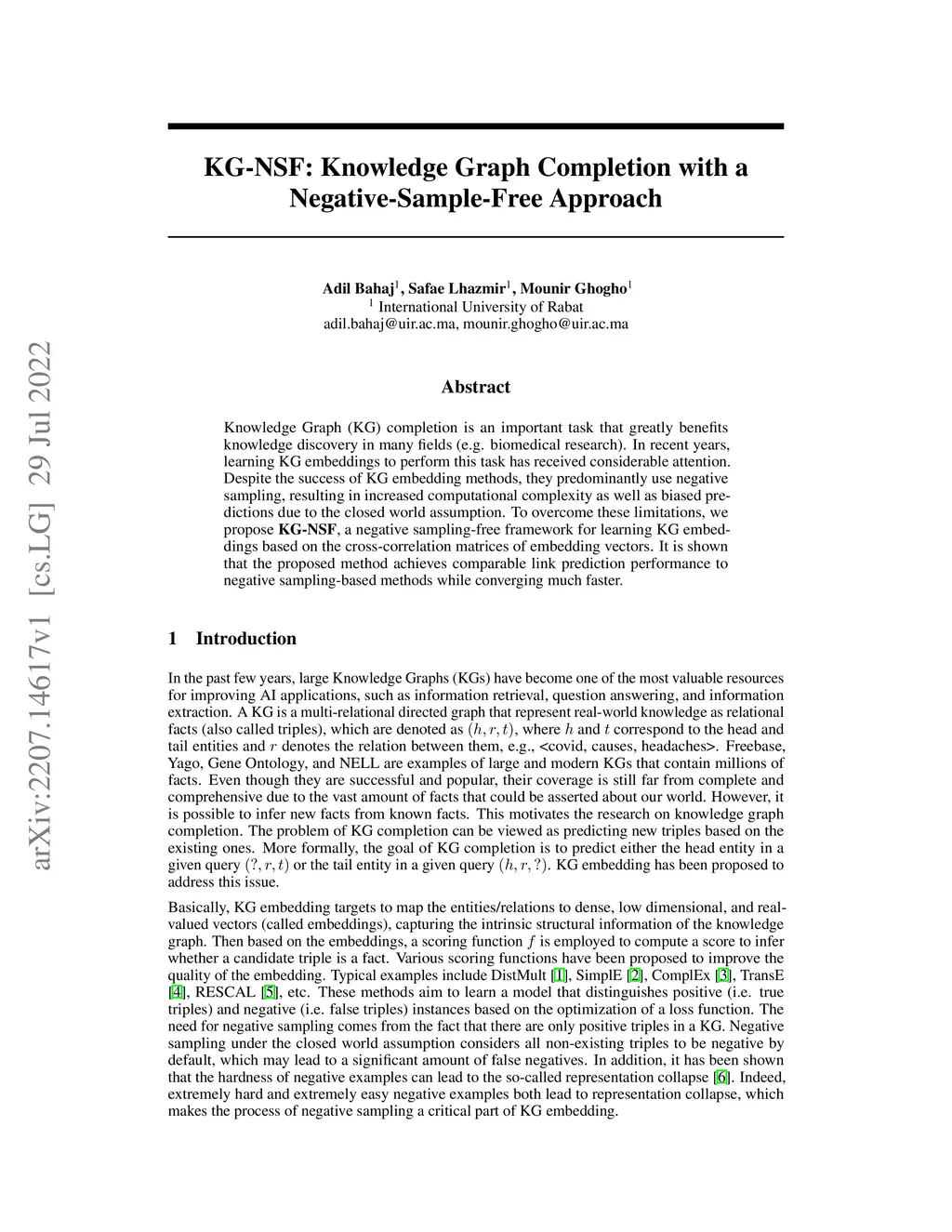 KG-NSF: Knowledge Graph Completion with a Negative-Sample-Free Approach
