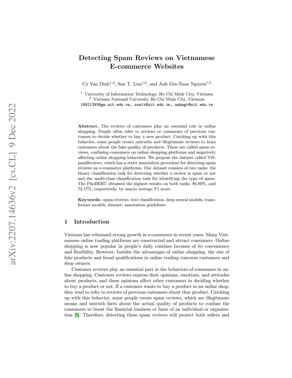 Detecting Spam Reviews on Vietnamese E-commerce Websites