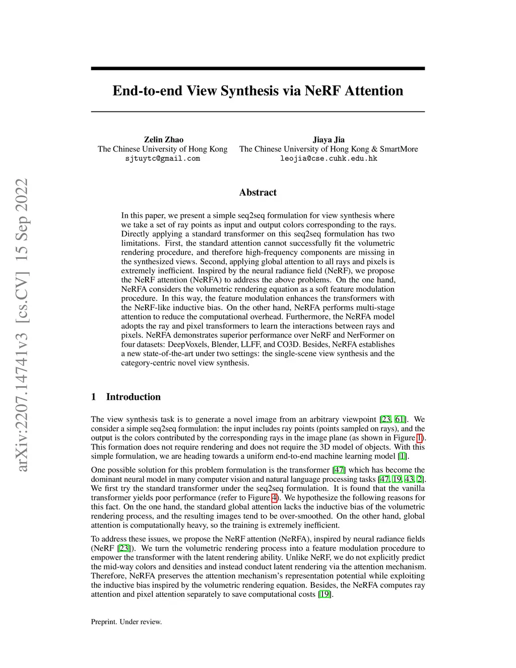 In this paper, we present a simple seq2seq formulation for view synthesis where we take a set of ray points as input and output colors corresponding to the rays. Directly applying a standard transformer on this seq2seq formulation has two limitations. First, the standard attention cannot successfully fit the volumetric rendering procedure, and therefore high-frequency components are missing in the synthesized views. Second, applying global attention to all rays and pixels is extremely inefficient. Inspired by the neural radiance field (NeRF), we propose the NeRF attention (NeRFA) to address the above problems. On the one hand, NeRFA considers the volumetric rendering equation as a soft feature modulation procedure. In this way, the feature modulation enhances the transformers with the NeRF-like inductive bias. On the other hand, NeRFA performs multi-stage attention to reduce the computational overhead. Furthermore, the NeRFA model adopts the ray and pixel transformers to learn the interactions between rays and pixels. NeRFA demonstrates superior performance over NeRF and NerFormer on four datasets: DeepVoxels, Blender, LLFF, and CO3D. Besides, NeRFA establishes a new state-of-the-art under two settings: the single-scene view synthesis and the category-centric novel view synthesis.