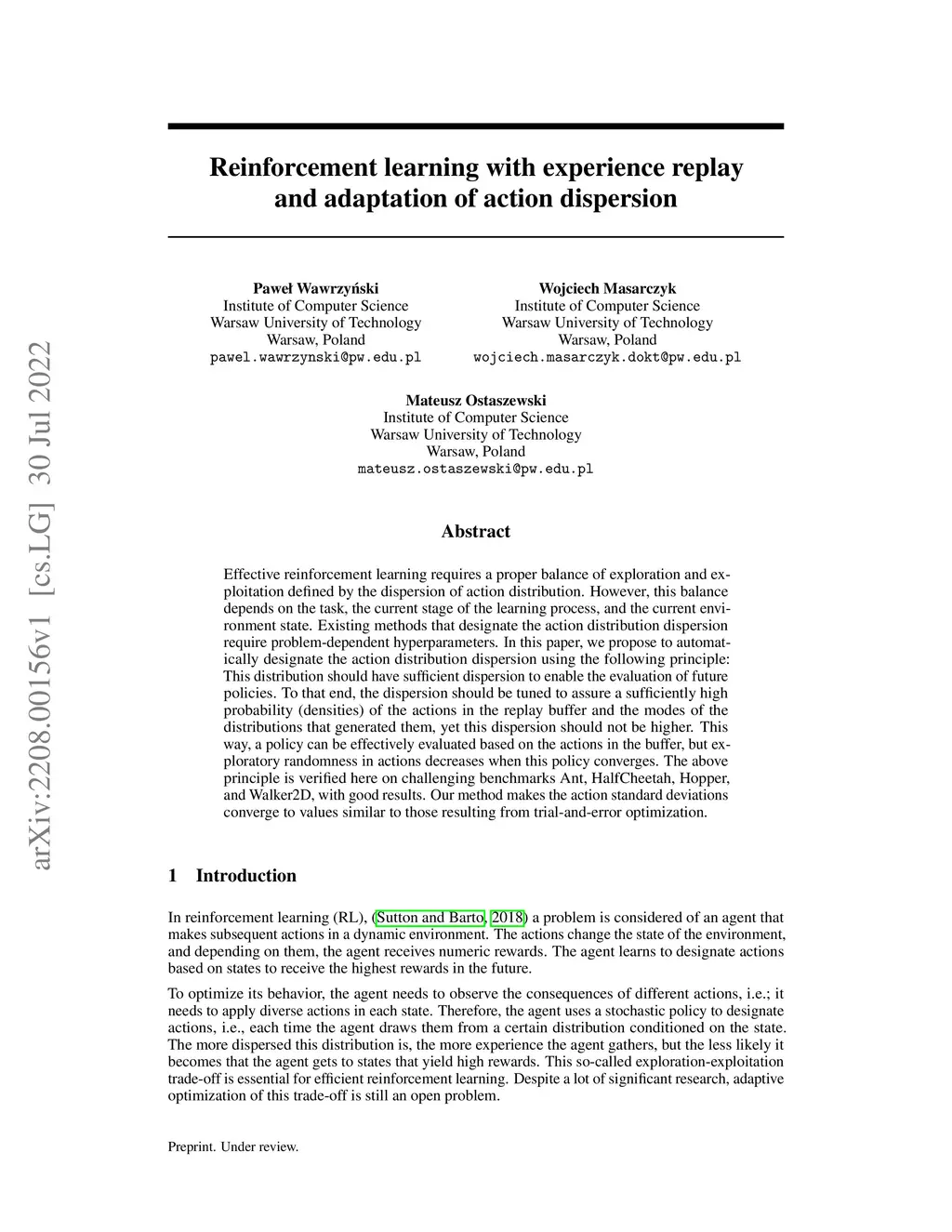Effective reinforcement learning requires a proper balance of exploration and exploitation defined by the dispersion of action distribution. However, this balance depends on the task, the current stage of the learning process, and the current environment state. Existing methods that designate the action distribution dispersion require problem-dependent hyperparameters. In this paper, we propose to automatically designate the action distribution dispersion using the following principle: This distribution should have sufficient dispersion to enable the evaluation of future policies. To that end, the dispersion should be tuned to assure a sufficiently high probability (densities) of the actions in the replay buffer and the modes of the distributions that generated them, yet this dispersion should not be higher. This way, a policy can be effectively evaluated based on the actions in the buffer, but exploratory randomness in actions decreases when this policy converges. The above principle is verified here on challenging benchmarks Ant, HalfCheetah, Hopper, and Walker2D, with good results. Our method makes the action standard deviations converge to values similar to those resulting from trial-and-error optimization.