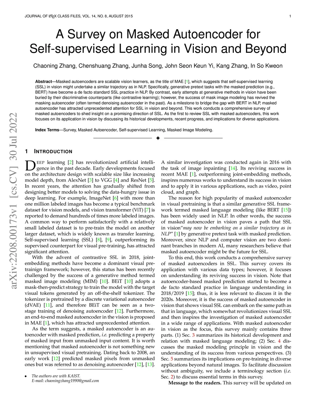 Masked autoencoders are scalable vision learners, as the title of MAE \cite{he2022masked}, which suggests that self-supervised learning (SSL) in vision might undertake a similar trajectory as in NLP. Specifically, generative pretext tasks with the masked prediction (e.g., BERT) have become a de facto standard SSL practice in NLP. By contrast, early attempts at generative methods in vision have been buried by their discriminative counterparts (like contrastive learning); however, the success of mask image modeling has revived the masking autoencoder (often termed denoising autoencoder in the past). As a milestone to bridge the gap with BERT in NLP, masked autoencoder has attracted unprecedented attention for SSL in vision and beyond. This work conducts a comprehensive survey of masked autoencoders to shed insight on a promising direction of SSL. As the first to review SSL with masked autoencoders, this work focuses on its application in vision by discussing its historical developments, recent progress, and implications for diverse applications.
