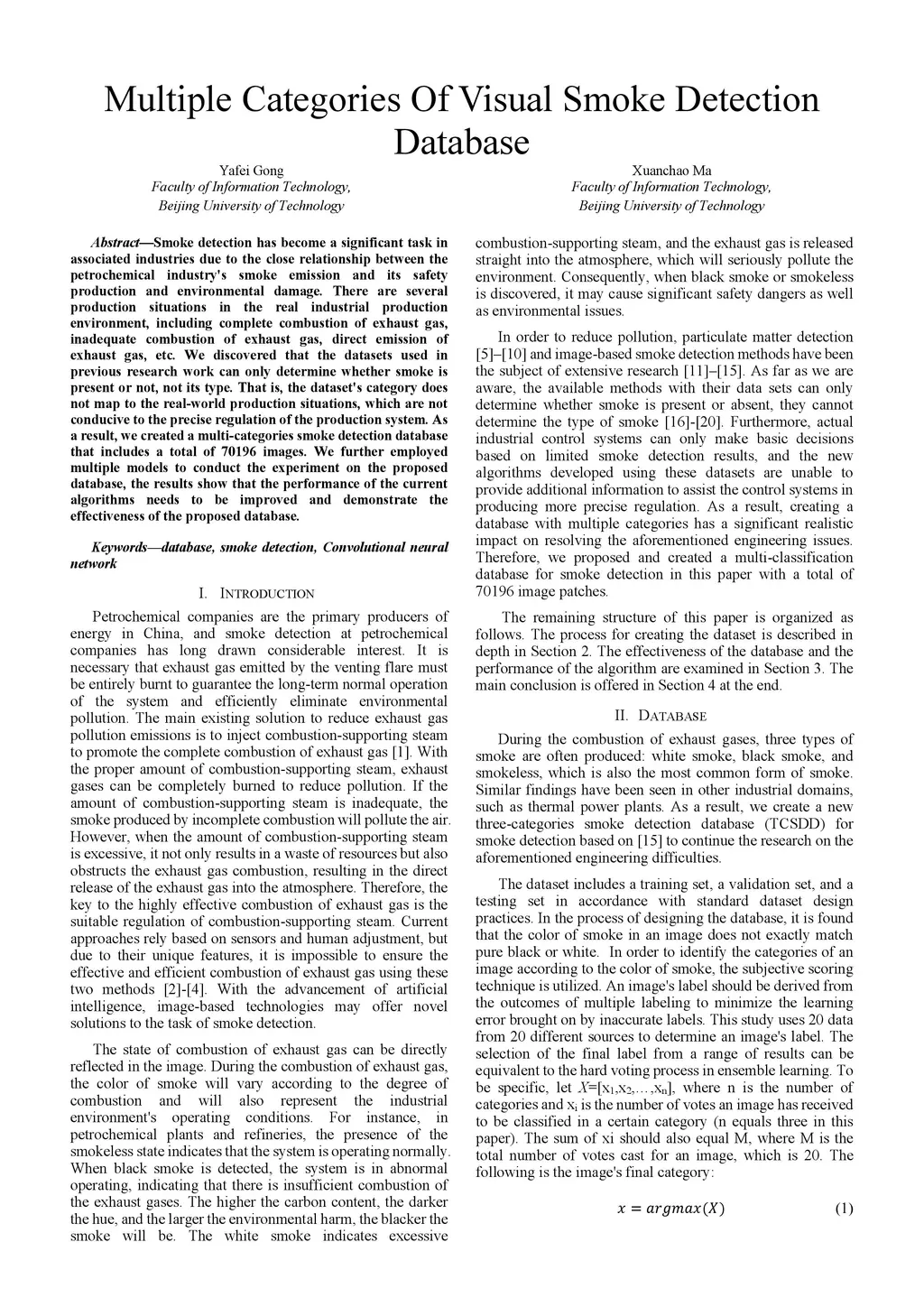 Smoke detection has become a significant task in associated industries due to the close relationship between the petrochemical industry's smoke emission and its safety production and environmental damage. There are several production situations in the real industrial production environment, including complete combustion of exhaust gas, inadequate combustion of exhaust gas, direct emission of exhaust gas, etc. We discovered that the datasets used in previous research work can only determine whether smoke is present or not, not its type. That is, the dataset's category does not map to the real-world production situations, which are not conducive to the precise regulation of the production system. As a result, we created a multi-categories smoke detection database that includes a total of 70196 images. We further employed multiple models to conduct the experiment on the proposed database, the results show that the performance of the current algorithms needs to be improved and demonstrate the effectiveness of the proposed database.