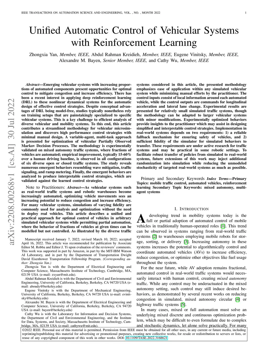 Unified Automatic Control of Vehicular Systems with Reinforcement