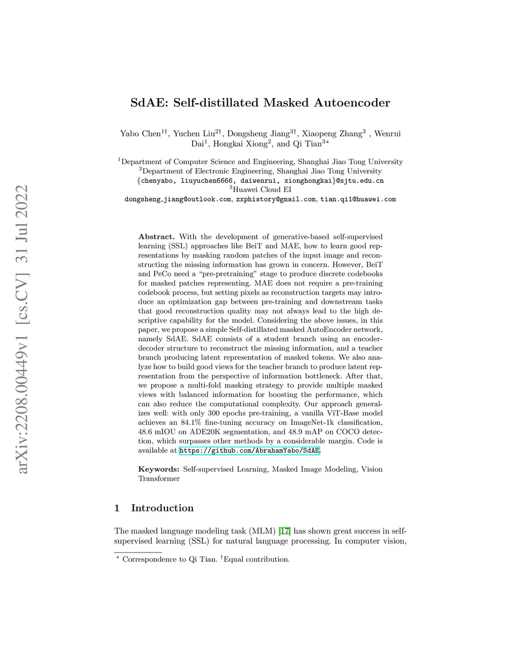 With the development of generative-based self-supervised learning (SSL) approaches like BeiT and MAE, how to learn good representations by masking random patches of the input image and reconstructing the missing information has grown in concern. However, BeiT and PeCo need a "pre-pretraining" stage to produce discrete codebooks for masked patches representing. MAE does not require a pre-training codebook process, but setting pixels as reconstruction targets may introduce an optimization gap between pre-training and downstream tasks that good reconstruction quality may not always lead to the high descriptive capability for the model. Considering the above issues, in this paper, we propose a simple Self-distillated masked AutoEncoder network, namely SdAE. SdAE consists of a student branch using an encoder-decoder structure to reconstruct the missing information, and a teacher branch producing latent representation of masked tokens. We also analyze how to build good views for the teacher branch to produce latent representation from the perspective of information bottleneck. After that, we propose a multi-fold masking strategy to provide multiple masked views with balanced information for boosting the performance, which can also reduce the computational complexity. Our approach generalizes well: with only 300 epochs pre-training, a vanilla ViT-Base model achieves an 84.1% fine-tuning accuracy on ImageNet-1k classification, 48.6 mIOU on ADE20K segmentation, and 48.9 mAP on COCO detection, which surpasses other methods by a considerable margin. Code is available at https://github.com/AbrahamYabo/SdAE.