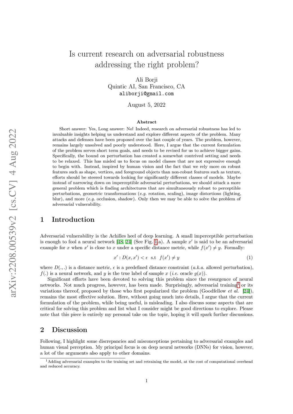 Short answer: Yes, Long answer: No! Indeed, research on adversarial robustness has led to invaluable insights helping us understand and explore different aspects of the problem. Many attacks and defenses have been proposed over the last couple of years. The problem, however, remains largely unsolved and poorly understood. Here, I argue that the current formulation of the problem serves short term goals, and needs to be revised for us to achieve bigger gains. Specifically, the bound on perturbation has created a somewhat contrived setting and needs to be relaxed. This has misled us to focus on model classes that are not expressive enough to begin with. Instead, inspired by human vision and the fact that we rely more on robust features such as shape, vertices, and foreground objects than non-robust features such as texture, efforts should be steered towards looking for significantly different classes of models. Maybe instead of narrowing down on imperceptible adversarial perturbations, we should attack a more general problem which is finding architectures that are simultaneously robust to perceptible perturbations, geometric transformations (e.g. rotation, scaling), image distortions (lighting, blur), and more (e.g. occlusion, shadow). Only then we may be able to solve the problem of adversarial vulnerability.