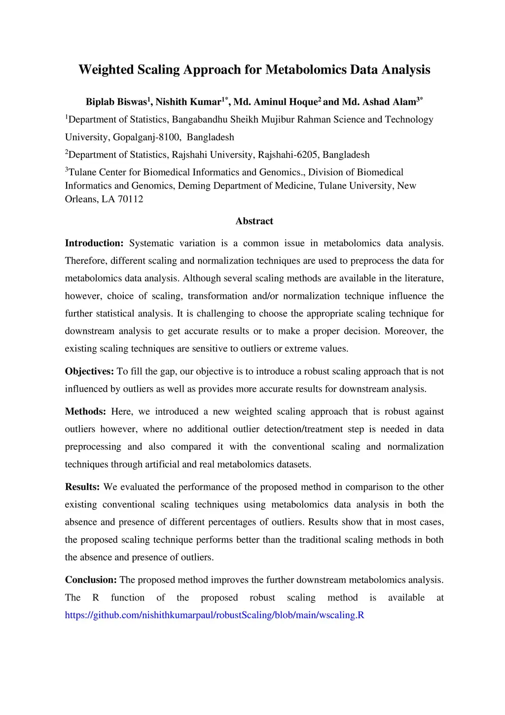 Systematic variation is a common issue in metabolomics data analysis. Therefore, different scaling and normalization techniques are used to preprocess the data for metabolomics data analysis. Although several scaling methods are available in the literature, however, choice of scaling, transformation and/or normalization technique influence the further statistical analysis. It is challenging to choose the appropriate scaling technique for downstream analysis to get accurate results or to make a proper decision. Moreover, the existing scaling techniques are sensitive to outliers or extreme values. To fill the gap, our objective is to introduce a robust scaling approach that is not influenced by outliers as well as provides more accurate results for downstream analysis. Here, we introduced a new weighted scaling approach that is robust against outliers however, where no additional outlier detection/treatment step is needed in data preprocessing and also compared it with the conventional scaling and normalization techniques through artificial and real metabolomics datasets. We evaluated the performance of the proposed method in comparison to the other existing conventional scaling techniques using metabolomics data analysis in both the absence and presence of different percentages of outliers. Results show that in most cases, the proposed scaling technique performs better than the traditional scaling methods in both the absence and presence of outliers. The proposed method improves the further downstream metabolomics analysis. The R function of the proposed robust scaling method is available at https://github.com/nishithkumarpaul/robustScaling/blob/main/wscaling.R