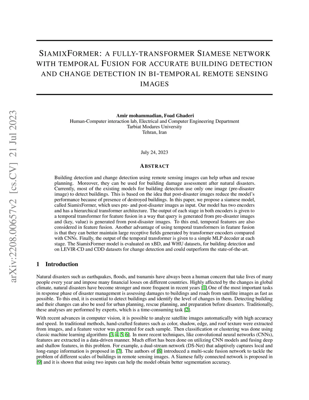 SiamixFormer: a fully-transformer Siamese network with temporal Fusion
