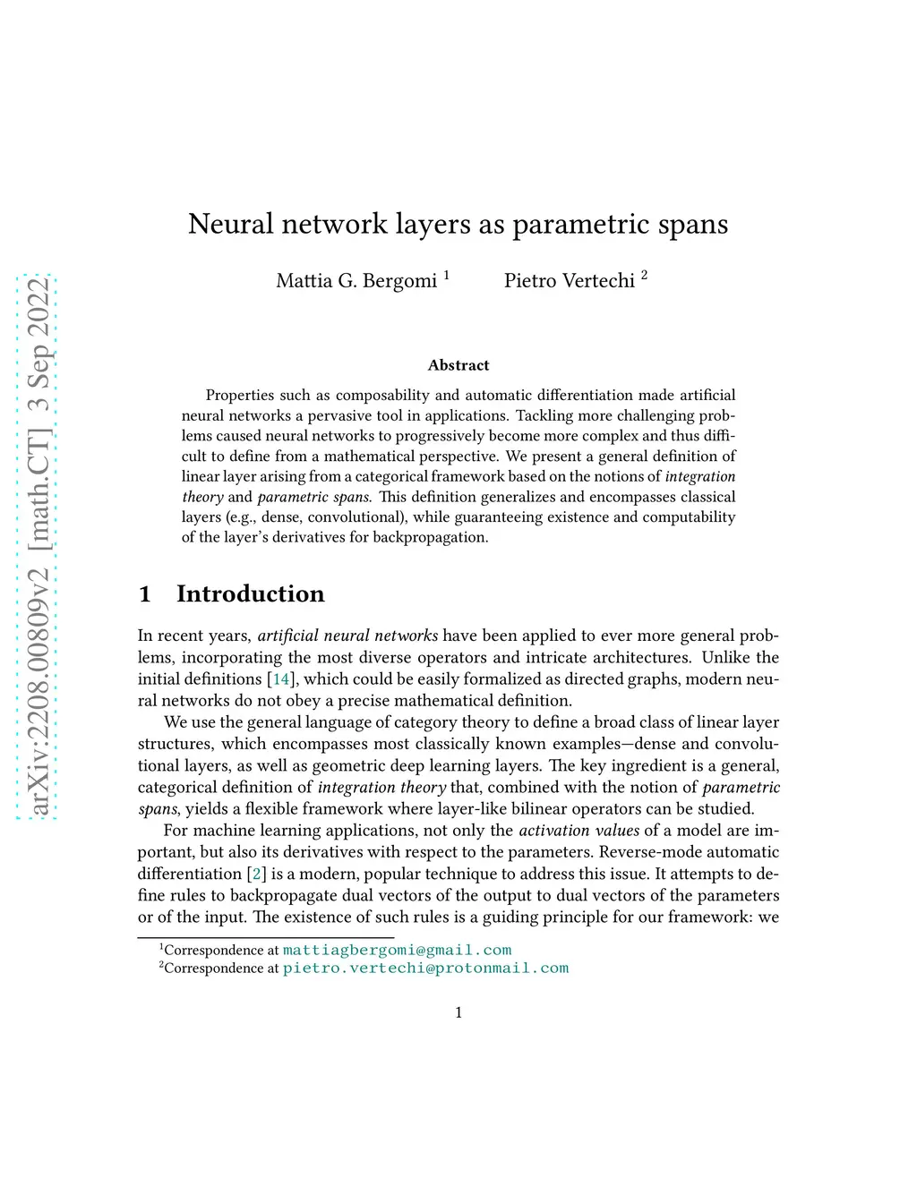 Properties such as composability and automatic differentiation made artificial neural networks a pervasive tool in applications. Tackling more challenging problems caused neural networks to progressively become more complex and thus difficult to define from a mathematical perspective. We present a general definition of linear layer arising from a categorical framework based on the notions of integration theory and parametric spans. This definition generalizes and encompasses classical layers (e.g., dense, convolutional), while guaranteeing existence and computability of the layer's derivatives for backpropagation.