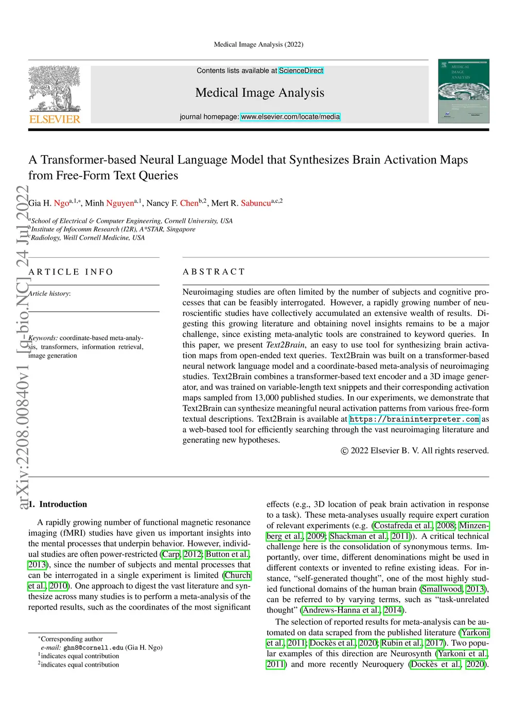 Neuroimaging studies are often limited by the number of subjects and cognitive processes that can be feasibly interrogated. However, a rapidly growing number of neuroscientific studies have collectively accumulated an extensive wealth of results. Digesting this growing literature and obtaining novel insights remains to be a major challenge, since existing meta-analytic tools are constrained to keyword queries. In this paper, we present Text2Brain, an easy to use tool for synthesizing brain activation maps from open-ended text queries. Text2Brain was built on a transformer-based neural network language model and a coordinate-based meta-analysis of neuroimaging studies. Text2Brain combines a transformer-based text encoder and a 3D image generator, and was trained on variable-length text snippets and their corresponding activation maps sampled from 13,000 published studies. In our experiments, we demonstrate that Text2Brain can synthesize meaningful neural activation patterns from various free-form textual descriptions. Text2Brain is available at https://braininterpreter.com as a web-based tool for efficiently searching through the vast neuroimaging literature and generating new hypotheses.