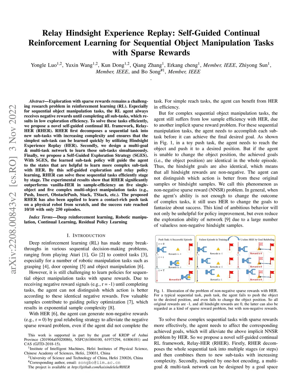 Exploration with sparse rewards remains a challenging research problem in reinforcement learning (RL). Especially for sequential object manipulation tasks, the RL agent always receives negative rewards until completing all sub-tasks, which results in low exploration efficiency. To solve these tasks efficiently, we propose a novel self-guided continual RL framework, RelayHER (RHER). RHER first decomposes a sequential task into new sub-tasks with increasing complexity and ensures that the simplest sub-task can be learned quickly by utilizing Hindsight Experience Replay (HER). Secondly, we design a multi-goal & multi-task network to learn these sub-tasks simultaneously. Finally, we propose a Self-Guided Exploration Strategy (SGES). With SGES, the learned sub-task policy will guide the agent to the states that are helpful to learn more complex sub-task with HER. By this self-guided exploration and relay policy learning, RHER can solve these sequential tasks efficiently stage by stage. The experimental results show that RHER significantly outperforms vanilla-HER in sample-efficiency on five singleobject and five complex multi-object manipulation tasks (e.g., Push, Insert, ObstaclePush, Stack, TStack, etc.). The proposed RHER has also been applied to learn a contact-rich push task on a physical robot from scratch, and the success rate reached 10/10 with only 250 episodes.