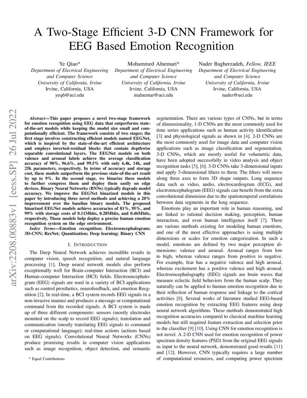 This paper proposes a novel two-stage framework for emotion recognition using EEG data that outperforms state-of-the-art models while keeping the model size small and computationally efficient. The framework consists of two stages; the first stage involves constructing efficient models named EEGNet, which is inspired by the state-of-the-art efficient architecture and employs inverted-residual blocks that contain depthwise separable convolutional layers. The EEGNet models on both valence and arousal labels achieve the average classification accuracy of 90%, 96.6%, and 99.5% with only 6.4k, 14k, and 25k parameters, respectively. In terms of accuracy and storage cost, these models outperform the previous state-of-the-art result by up to 9%. In the second stage, we binarize these models to further compress them and deploy them easily on edge devices. Binary Neural Networks (BNNs) typically degrade model accuracy. We improve the EEGNet binarized models in this paper by introducing three novel methods and achieving a 20\% improvement over the baseline binary models. The proposed binarized EEGNet models achieve accuracies of 81%, 95%, and 99% with storage costs of 0.11Mbits, 0.28Mbits, and 0.46Mbits, respectively. Those models help deploy a precise human emotion recognition system on the edge environment.
