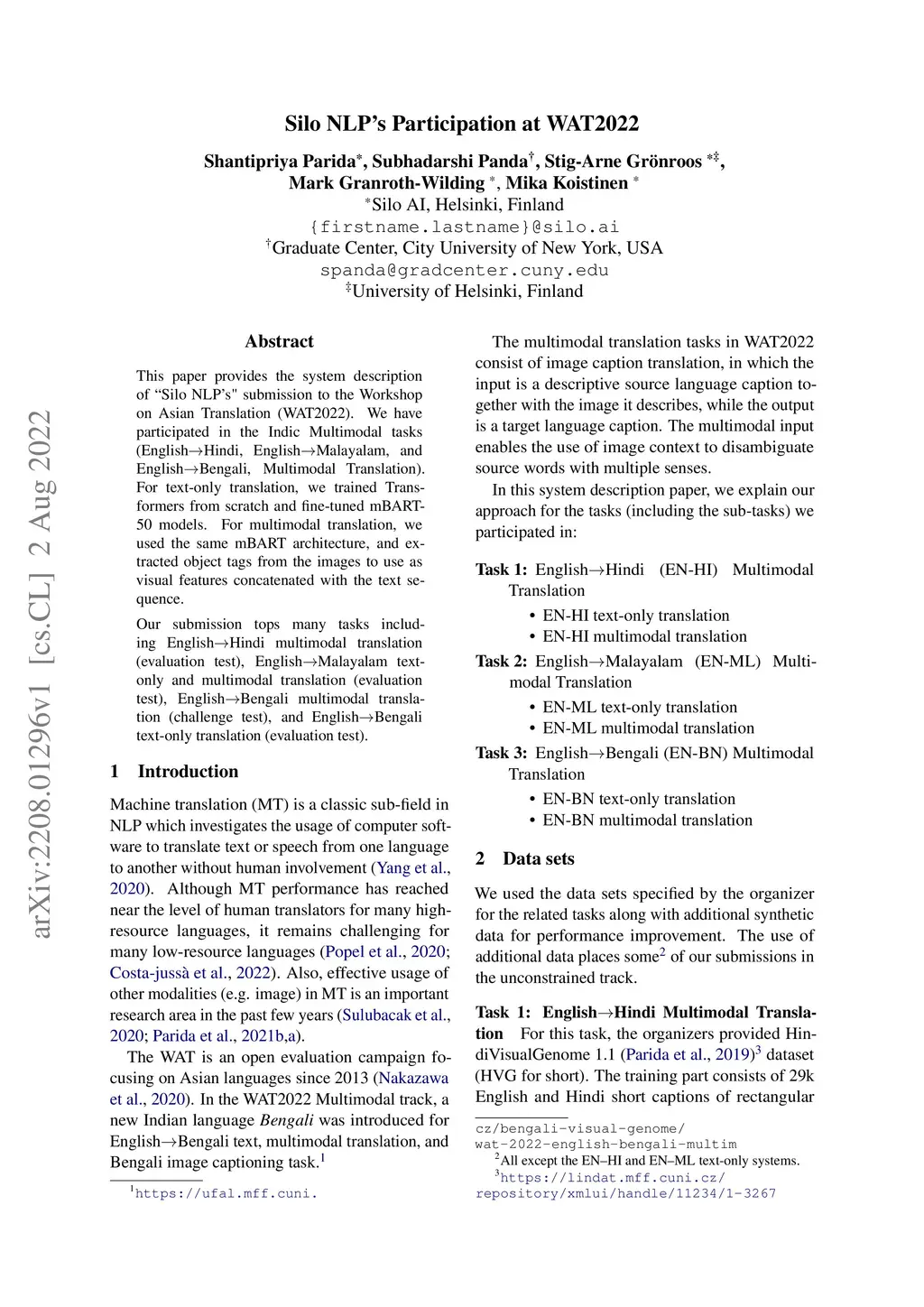This paper provides the system description of "Silo NLP's" submission to the Workshop on Asian Translation (WAT2022). We have participated in the Indic Multimodal tasks (English->Hindi, English->Malayalam, and English->Bengali Multimodal Translation). For text-only translation, we trained Transformers from scratch and fine-tuned mBART-50 models. For multimodal translation, we used the same mBART architecture and extracted object tags from the images to use as visual features concatenated with the text sequence. Our submission tops many tasks including English->Hindi multimodal translation (evaluation test), English->Malayalam text-only and multimodal translation (evaluation test), English->Bengali multimodal translation (challenge test), and English->Bengali text-only translation (evaluation test).