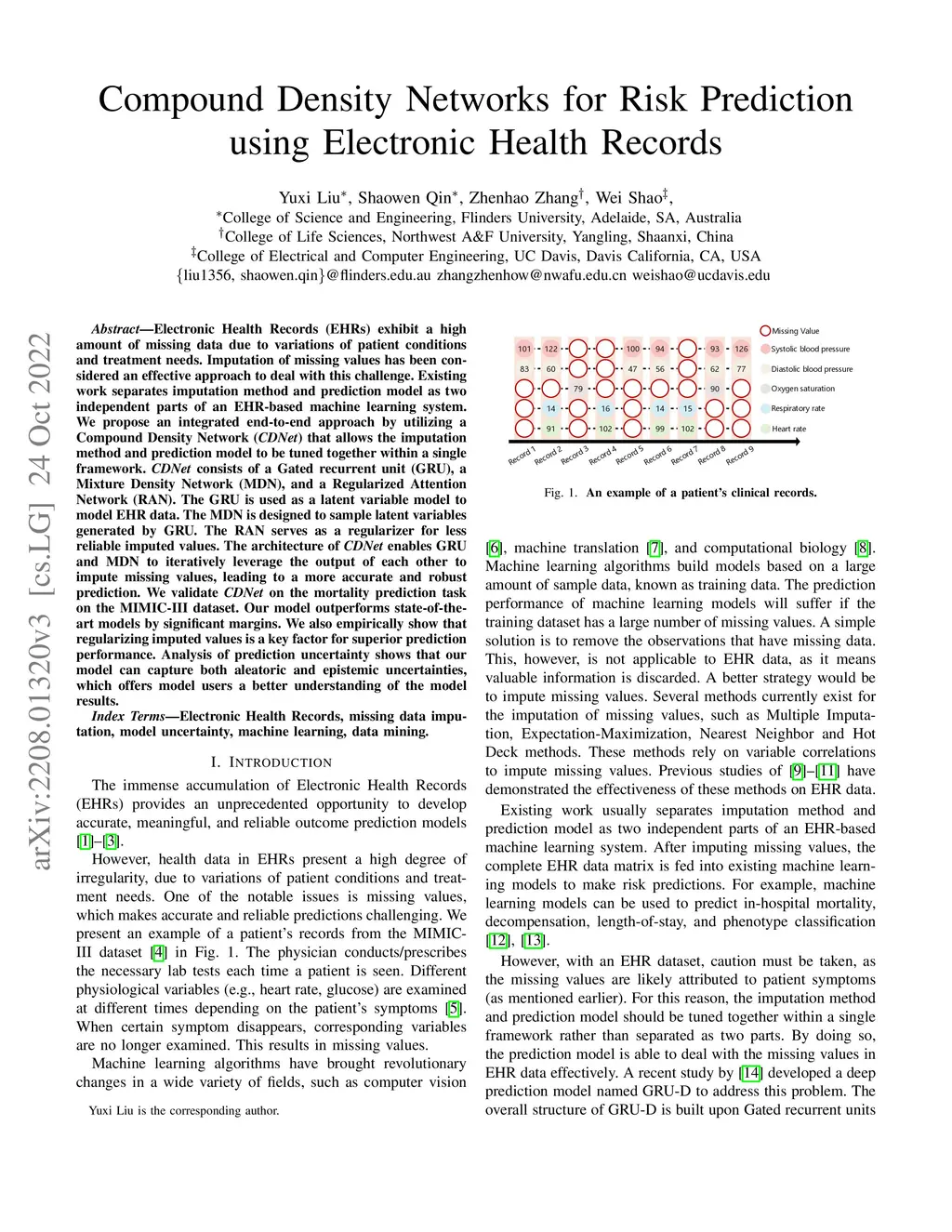 Electronic Health Records (EHRs) exhibit a high amount of missing data due to variations of patient conditions and treatment needs. Imputation of missing values has been considered an effective approach to deal with this challenge. Existing work separates imputation method and prediction model as two independent parts of an EHR-based machine learning system. We propose an integrated end-to-end approach by utilizing a Compound Density Network (CDNet) that allows the imputation method and prediction model to be tuned together within a single framework. CDNet consists of a Gated recurrent unit (GRU), a Mixture Density Network (MDN), and a Regularized Attention Network (RAN). The GRU is used as a latent variable model to model EHR data. The MDN is designed to sample latent variables generated by GRU. The RAN serves as a regularizer for less reliable imputed values. The architecture of CDNet enables GRU and MDN to iteratively leverage the output of each other to impute missing values, leading to a more accurate and robust prediction. We validate CDNet on the mortality prediction task on the MIMIC-III dataset. Our model outperforms state-of-the-art models by significant margins. We also empirically show that regularizing imputed values is a key factor for superior prediction performance. Analysis of prediction uncertainty shows that our model can capture both aleatoric and epistemic uncertainties, which offers model users a better understanding of the model results.