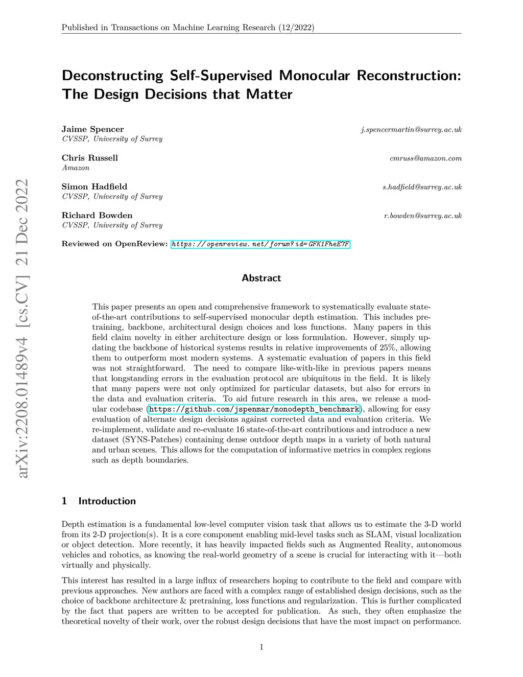 This paper presents an open and comprehensive framework to systematically evaluate state-of-the-art contributions to self-supervised monocular depth estimation. This includes pretraining, backbone, architectural design choices and loss functions. Many papers in this field claim novelty in either architecture design or loss formulation. However, simply updating the backbone of historical systems results in relative improvements of 25%, allowing them to outperform the majority of existing systems. A systematic evaluation of papers in this field was not straightforward. The need to compare like-with-like in previous papers means that longstanding errors in the evaluation protocol are ubiquitous in the field. It is likely that many papers were not only optimized for particular datasets, but also for errors in the data and evaluation criteria. To aid future research in this area, we release a modular codebase (https://github.com/jspenmar/monodepth_benchmark), allowing for easy evaluation of alternate design decisions against corrected data and evaluation criteria. We re-implement, validate and re-evaluate 16 state-of-the-art contributions and introduce a new dataset (SYNS-Patches) containing dense outdoor depth maps in a variety of both natural and urban scenes. This allows for the computation of informative metrics in complex regions such as depth boundaries.