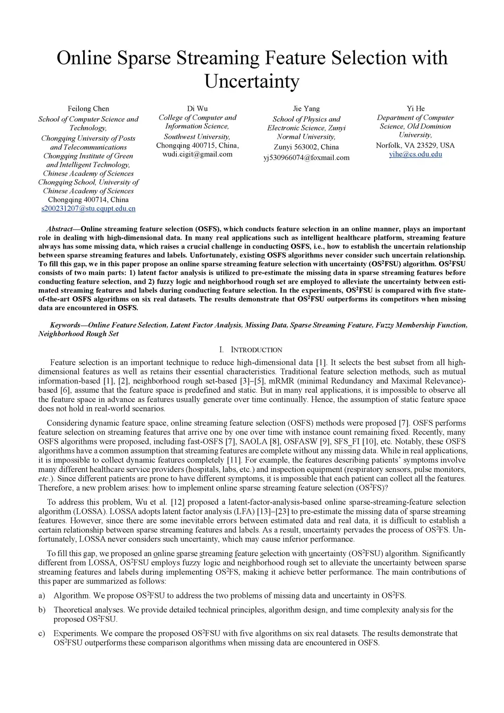 Online streaming feature selection (OSFS), which conducts feature selection in an online manner, plays an important role in dealing with high-dimensional data. In many real applications such as intelligent healthcare platform, streaming feature always has some missing data, which raises a crucial challenge in conducting OSFS, i.e., how to establish the uncertain relationship between sparse streaming features and labels. Unfortunately, existing OSFS algorithms never consider such uncertain relationship. To fill this gap, we in this paper propose an online sparse streaming feature selection with uncertainty (OS2FSU) algorithm. OS2FSU consists of two main parts: 1) latent factor analysis is utilized to pre-estimate the missing data in sparse streaming features before con-ducting feature selection, and 2) fuzzy logic and neighborhood rough set are employed to alleviate the uncertainty between estimated streaming features and labels during conducting feature selection. In the experiments, OS2FSU is compared with five state-of-the-art OSFS algorithms on six real datasets. The results demonstrate that OS2FSU outperforms its competitors when missing data are encountered in OSFS.