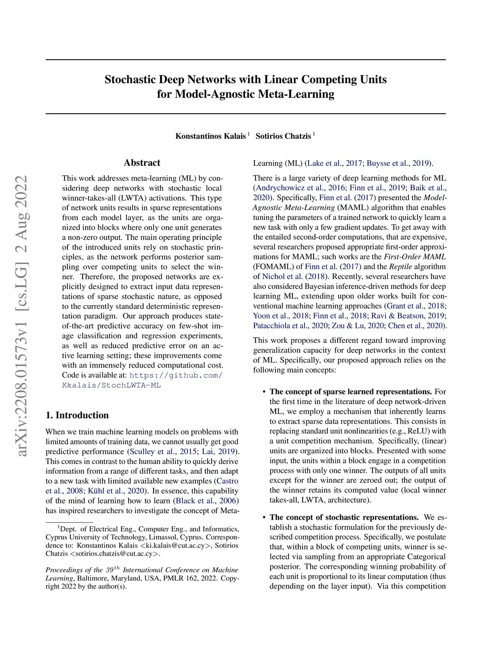 This work addresses meta-learning (ML) by considering deep networks with stochastic local winner-takes-all (LWTA) activations. This type of network units results in sparse representations from each model layer, as the units are organized into blocks where only one unit generates a non-zero output. The main operating principle of the introduced units rely on stochastic principles, as the network performs posterior sampling over competing units to select the winner. Therefore, the proposed networks are explicitly designed to extract input data representations of sparse stochastic nature, as opposed to the currently standard deterministic representation paradigm. Our approach produces state-of-the-art predictive accuracy on few-shot image classification and regression experiments, as well as reduced predictive error on an active learning setting; these improvements come with an immensely reduced computational cost.