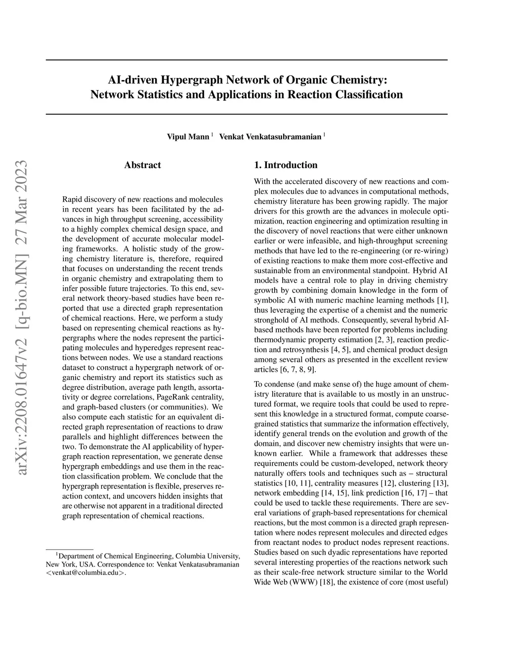 Rapid discovery of new reactions and molecules in recent years has been facilitated by the advancements in high throughput screening, accessibility to a much more complex chemical design space, and the development of accurate molecular modeling frameworks. A holistic study of the growing chemistry literature is, therefore, required that focuses on understanding the recent trends and extrapolating them into possible future trajectories. To this end, several network theory-based studies have been reported that use a directed graph representation of chemical reactions. Here, we perform a study based on representing chemical reactions as hypergraphs where the hyperedges represent chemical reactions and nodes represent the participating molecules. We use a standard reactions dataset to construct a hypernetwork and report its statistics such as degree distributions, average path length, assortativity or degree correlations, PageRank centrality, and graph-based clusters (or communities). We also compute each statistic for an equivalent directed graph representation of reactions to draw parallels and highlight differences between the two. To demonstrate the AI applicability of hypergraph reaction representation, we generate dense hypergraph embeddings and use them in the reaction classification problem. We conclude that the hypernetwork representation is flexible, preserves reaction context, and uncovers hidden insights that are otherwise not apparent in a traditional directed graph representation of chemical reactions.