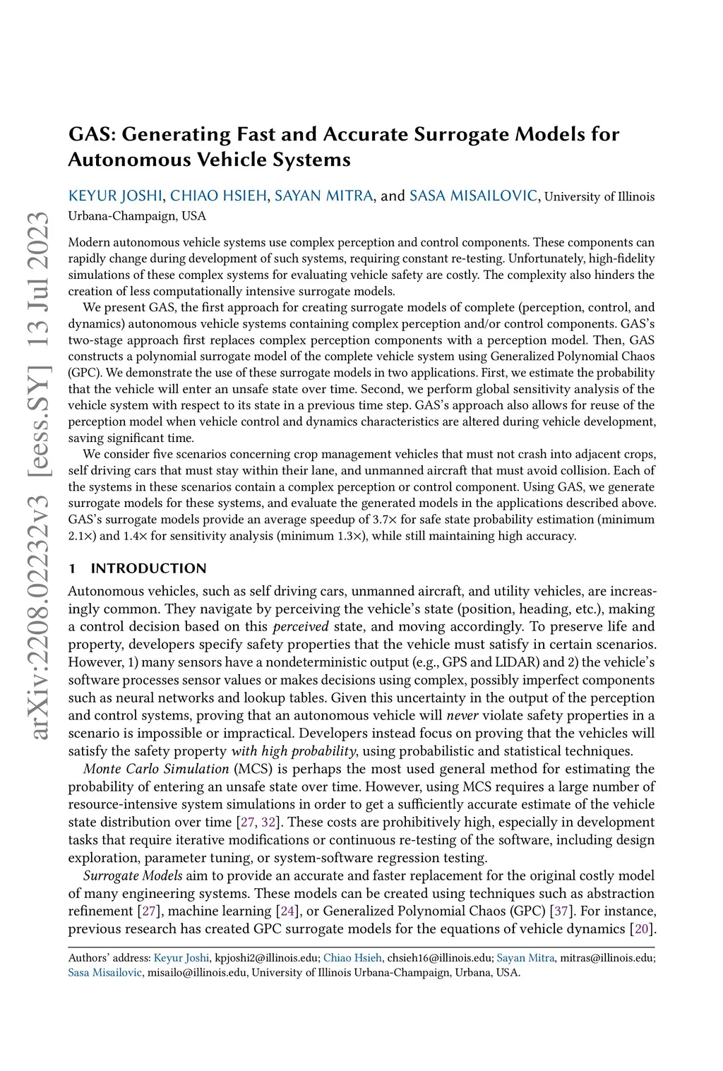 Modern autonomous vehicle systems use complex perception and control components. These components can rapidly change during development of such systems, requiring constant re-testing. Unfortunately, high-fidelity simulations of these complex systems for evaluating vehicle safety are costly. The complexity also hinders the creation of less computationally intensive surrogate models. We present GAS, the first approach for creating surrogate models of complete (perception, control, and dynamics) autonomous vehicle systems containing complex perception and/or control components. GAS's two-stage approach first replaces complex perception components with a perception model. Then, GAS constructs a polynomial surrogate model of the complete vehicle system using Generalized Polynomial Chaos (GPC). We demonstrate the use of these surrogate models in two applications. First, we estimate the probability that the vehicle will enter an unsafe state over time. Second, we perform global sensitivity analysis of the vehicle system with respect to its state in a previous time step. GAS's approach also allows for reuse of the perception model when vehicle control and dynamics characteristics are altered during vehicle development, saving significant time. We consider five scenarios concerning crop management vehicles that must not crash into adjacent crops, self driving cars that must stay within their lane, and unmanned aircraft that must avoid collision. Each of the systems in these scenarios contain a complex perception or control component. Using GAS, we generate surrogate models for these systems, and evaluate the generated models in the applications described above. GAS's surrogate models provide an average speedup of for safe state probability estimation (minimum ) and for sensitivity analysis (minimum ), while still maintaining high accuracy.