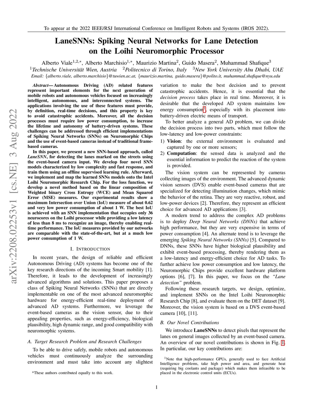 Autonomous Driving (AD) related features represent important elements for the next generation of mobile robots and autonomous vehicles focused on increasingly intelligent, autonomous, and interconnected systems. The applications involving the use of these features must provide, by definition, real-time decisions, and this property is key to avoid catastrophic accidents. Moreover, all the decision processes must require low power consumption, to increase the lifetime and autonomy of battery-driven systems. These challenges can be addressed through efficient implementations of Spiking Neural Networks (SNNs) on Neuromorphic Chips and the use of event-based cameras instead of traditional frame-based cameras. In this paper, we present a new SNN-based approach, called LaneSNN, for detecting the lanes marked on the streets using the event-based camera input. We develop four novel SNN models characterized by low complexity and fast response, and train them using an offline supervised learning rule. Afterward, we implement and map the learned SNNs models onto the Intel Loihi Neuromorphic Research Chip. For the loss function, we develop a novel method based on the linear composition of Weighted binary Cross Entropy (WCE) and Mean Squared Error (MSE) measures. Our experimental results show a maximum Intersection over Union (IoU) measure of about 0.62 and very low power consumption of about 1 W. The best IoU is achieved with an SNN implementation that occupies only 36 neurocores on the Loihi processor while providing a low latency of less than 8 ms to recognize an image, thereby enabling real-time performance. The IoU measures provided by our networks are comparable with the state-of-the-art, but at a much low power consumption of 1 W.