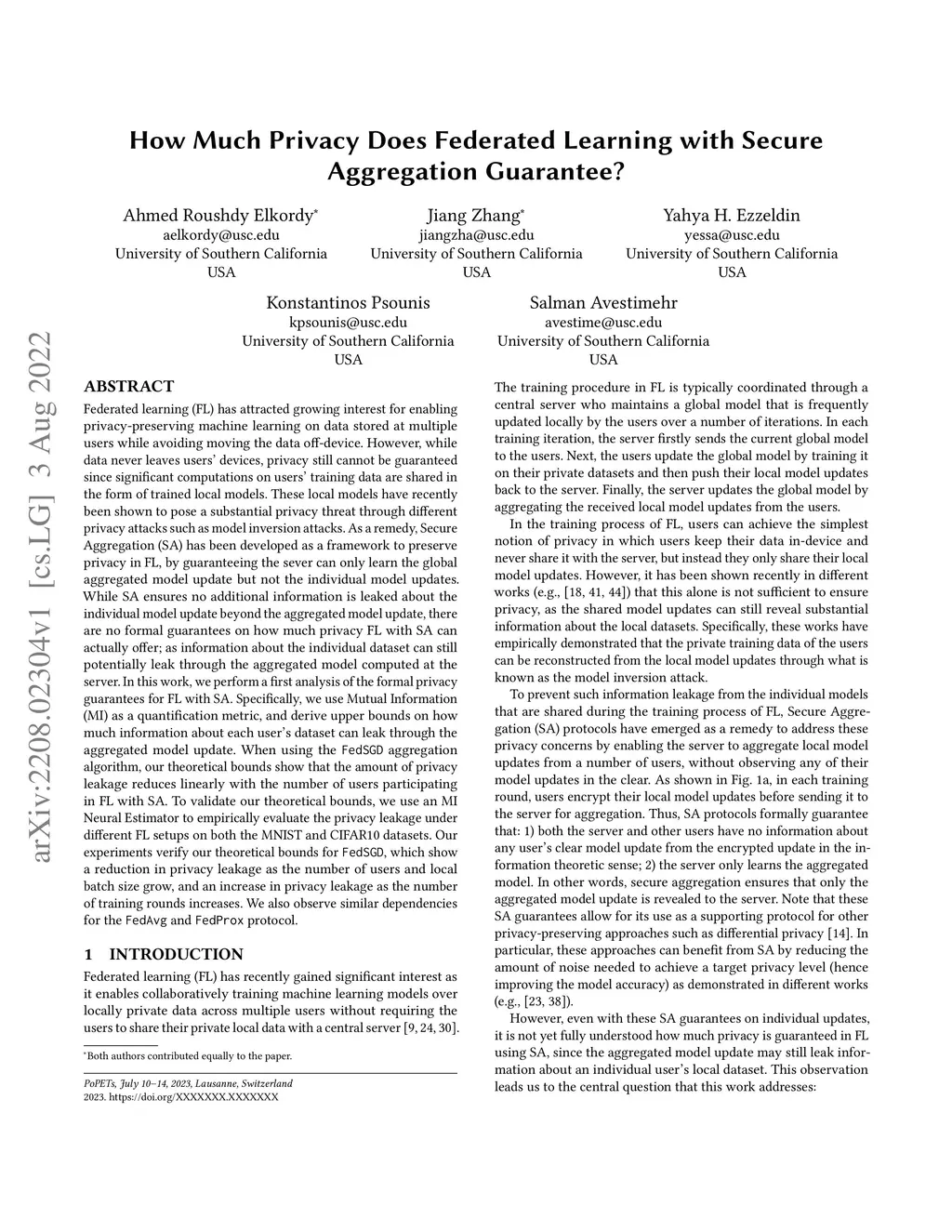 Federated learning (FL) has attracted growing interest for enabling privacy-preserving machine learning on data stored at multiple users while avoiding moving the data off-device. However, while data never leaves users' devices, privacy still cannot be guaranteed since significant computations on users' training data are shared in the form of trained local models. These local models have recently been shown to pose a substantial privacy threat through different privacy attacks such as model inversion attacks. As a remedy, Secure Aggregation (SA) has been developed as a framework to preserve privacy in FL, by guaranteeing the server can only learn the global aggregated model update but not the individual model updates. While SA ensures no additional information is leaked about the individual model update beyond the aggregated model update, there are no formal guarantees on how much privacy FL with SA can actually offer; as information about the individual dataset can still potentially leak through the aggregated model computed at the server. In this work, we perform a first analysis of the formal privacy guarantees for FL with SA. Specifically, we use Mutual Information (MI) as a quantification metric and derive upper bounds on how much information about each user's dataset can leak through the aggregated model update. When using the FedSGD aggregation algorithm, our theoretical bounds show that the amount of privacy leakage reduces linearly with the number of users participating in FL with SA. To validate our theoretical bounds, we use an MI Neural Estimator to empirically evaluate the privacy leakage under different FL setups on both the MNIST and CIFAR10 datasets. Our experiments verify our theoretical bounds for FedSGD, which show a reduction in privacy leakage as the number of users and local batch size grow, and an increase in privacy leakage with the number of training rounds.