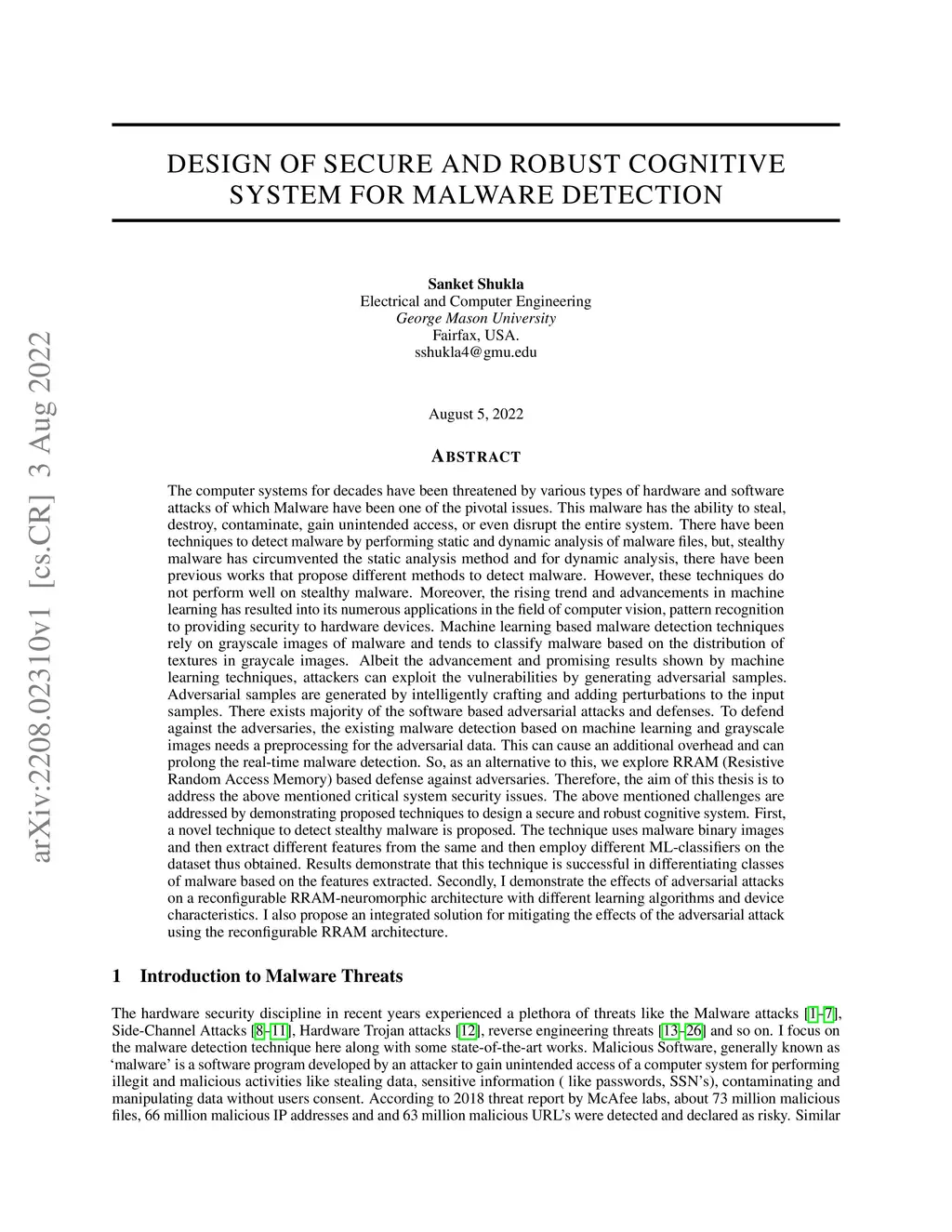 Machine learning based malware detection techniques rely on grayscale images of malware and tends to classify malware based on the distribution of textures in graycale images. Albeit the advancement and promising results shown by machine learning techniques, attackers can exploit the vulnerabilities by generating adversarial samples. Adversarial samples are generated by intelligently crafting and adding perturbations to the input samples. There exists majority of the software based adversarial attacks and defenses. To defend against the adversaries, the existing malware detection based on machine learning and grayscale images needs a preprocessing for the adversarial data. This can cause an additional overhead and can prolong the real-time malware detection. So, as an alternative to this, we explore RRAM (Resistive Random Access Memory) based defense against adversaries. Therefore, the aim of this thesis is to address the above mentioned critical system security issues. The above mentioned challenges are addressed by demonstrating proposed techniques to design a secure and robust cognitive system. First, a novel technique to detect stealthy malware is proposed. The technique uses malware binary images and then extract different features from the same and then employ different ML-classifiers on the dataset thus obtained. Results demonstrate that this technique is successful in differentiating classes of malware based on the features extracted. Secondly, I demonstrate the effects of adversarial attacks on a reconfigurable RRAM-neuromorphic architecture with different learning algorithms and device characteristics. I also propose an integrated solution for mitigating the effects of the adversarial attack using the reconfigurable RRAM architecture.