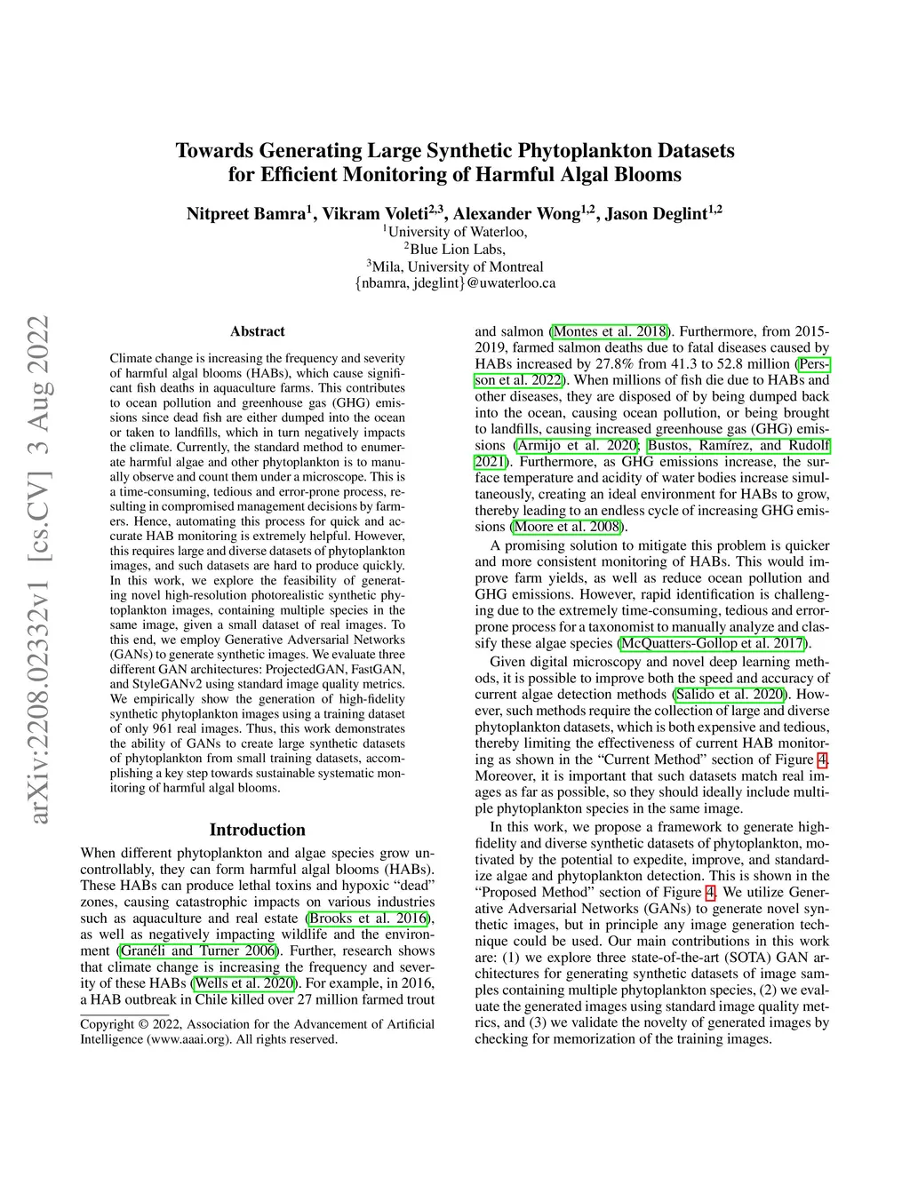 Climate change is increasing the frequency and severity of harmful algal blooms (HABs), which cause significant fish deaths in aquaculture farms. This contributes to ocean pollution and greenhouse gas (GHG) emissions since dead fish are either dumped into the ocean or taken to landfills, which in turn negatively impacts the climate. Currently, the standard method to enumerate harmful algae and other phytoplankton is to manually observe and count them under a microscope. This is a time-consuming, tedious and error-prone process, resulting in compromised management decisions by farmers. Hence, automating this process for quick and accurate HAB monitoring is extremely helpful. However, this requires large and diverse datasets of phytoplankton images, and such datasets are hard to produce quickly. In this work, we explore the feasibility of generating novel high-resolution photorealistic synthetic phytoplankton images, containing multiple species in the same image, given a small dataset of real images. To this end, we employ Generative Adversarial Networks (GANs) to generate synthetic images. We evaluate three different GAN architectures: ProjectedGAN, FastGAN, and StyleGANv2 using standard image quality metrics. We empirically show the generation of high-fidelity synthetic phytoplankton images using a training dataset of only 961 real images. Thus, this work demonstrates the ability of GANs to create large synthetic datasets of phytoplankton from small training datasets, accomplishing a key step towards sustainable systematic monitoring of harmful algal blooms.