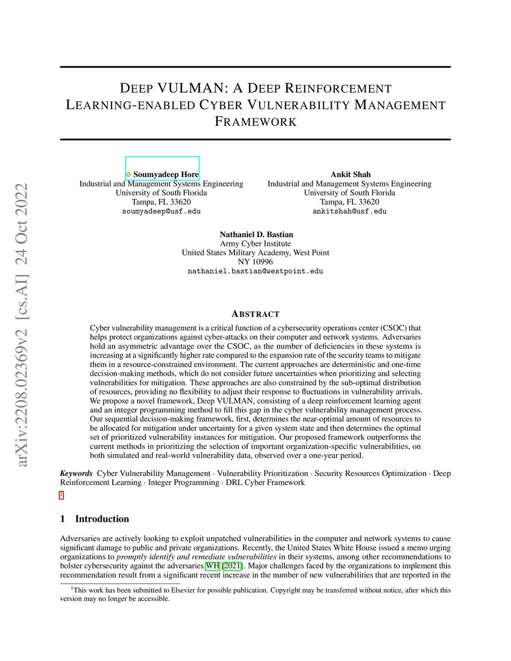 Deep VULMAN: A Deep Reinforcement Learning-Enabled Cyber Vulnerability
