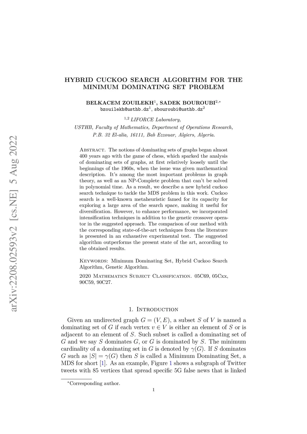 Hybrid cuckoo search algorithm for the minimum dominating set problem