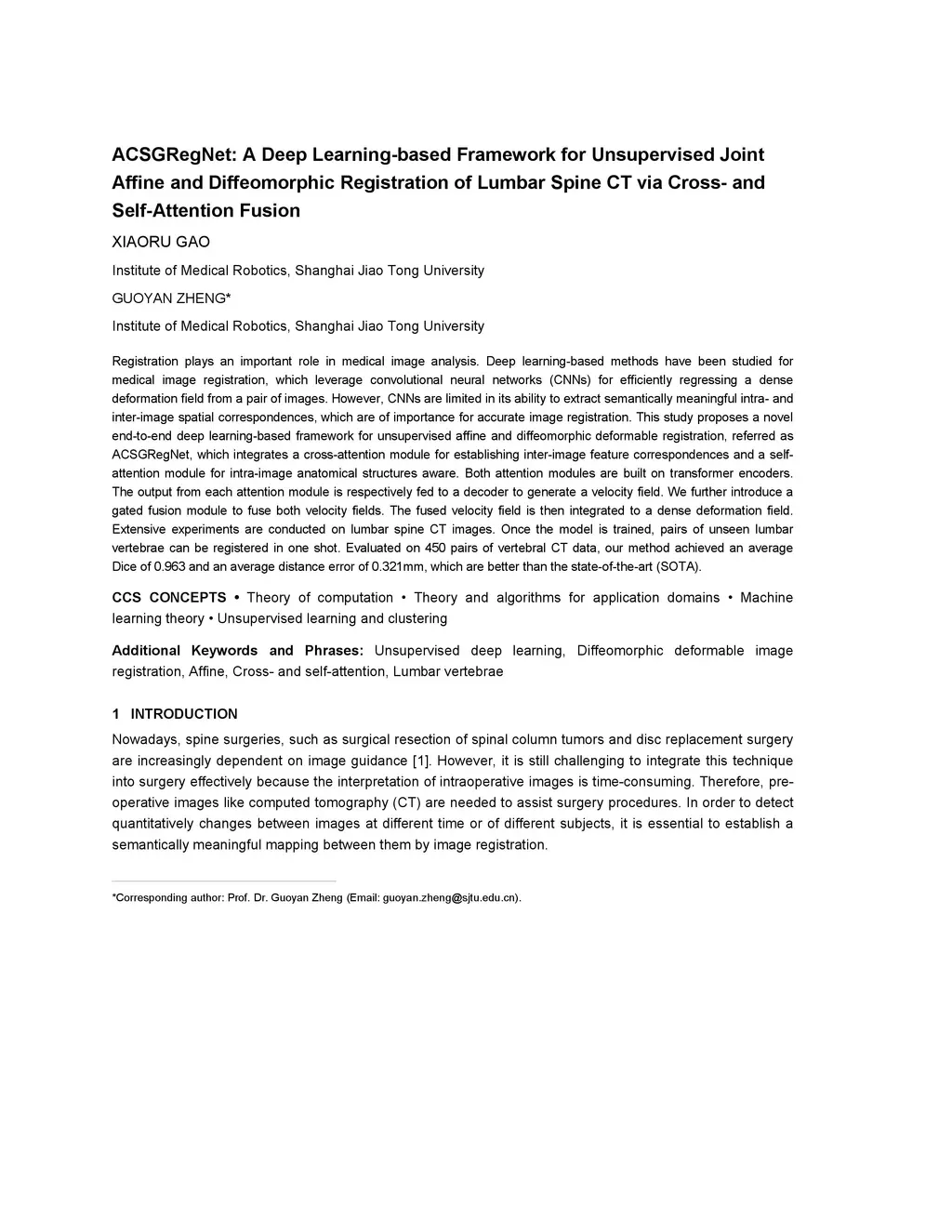 Registration plays an important role in medical image analysis. Deep learning-based methods have been studied for medical image registration, which leverage convolutional neural networks (CNNs) for efficiently regressing a dense deformation field from a pair of images. However, CNNs are limited in its ability to extract semantically meaningful intra- and inter-image spatial correspondences, which are of importance for accurate image registration. This study proposes a novel end-to-end deep learning-based framework for unsupervised affine and diffeomorphic deformable registration, referred as ACSGRegNet, which integrates a cross-attention module for establishing inter-image feature correspondences and a self-attention module for intra-image anatomical structures aware. Both attention modules are built on transformer encoders. The output from each attention module is respectively fed to a decoder to generate a velocity field. We further introduce a gated fusion module to fuse both velocity fields. The fused velocity field is then integrated to a dense deformation field. Extensive experiments are conducted on lumbar spine CT images. Once the model is trained, pairs of unseen lumbar vertebrae can be registered in one shot. Evaluated on 450 pairs of vertebral CT data, our method achieved an average Dice of 0.963 and an average distance error of 0.321mm, which are better than the state-of-the-art (SOTA).