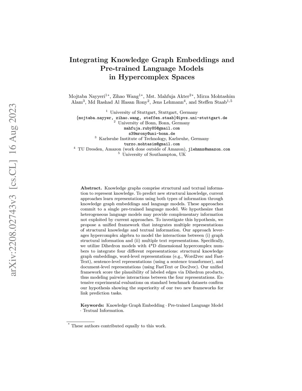 Knowledge Graphs, such as Wikidata, comprise structural and textual knowledge in order to represent knowledge. For each of the two modalities dedicated approaches for graph embedding and language models learn patterns that allow for predicting novel structural knowledge. Few approaches have integrated learning and inference with both modalities and these existing ones could only partially exploit the interaction of structural and textual knowledge. In our approach, we build on existing strong representations of single modalities and we use hypercomplex algebra to represent both, (i), single-modality embedding as well as, (ii), the interaction between different modalities and their complementary means of knowledge representation. More specifically, we suggest Dihedron and Quaternion representations of 4D hypercomplex numbers to integrate four modalities namely structural knowledge graph embedding, word-level representations (e.g.\ Word2vec, Fasttext), sentence-level representations (Sentence transformer), and document-level representations (sentence transformer, Doc2vec). Our unified vector representation scores the plausibility of labelled edges via Hamilton and Dihedron products, thus modeling pairwise interactions between different modalities. Extensive experimental evaluation on standard benchmark datasets shows the superiority of our two new models using abundant textual information besides sparse structural knowledge to enhance performance in link prediction tasks.