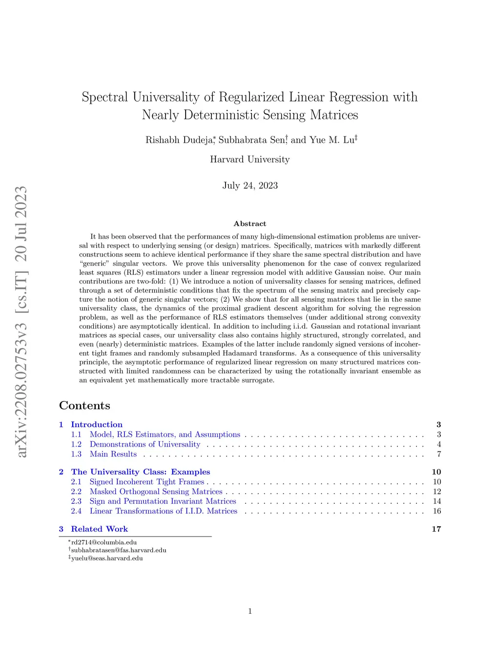 It has been observed that the performances of many high-dimensional estimation problems are universal with respect to underlying sensing (or design) matrices. Specifically, matrices with markedly different constructions seem to achieve identical performance if they share the same spectral distribution and have ``generic'' singular vectors. We prove this universality phenomenon for the case of convex regularized least squares (RLS) estimators under a linear regression model with additive Gaussian noise. Our main contributions are two-fold: (1) We introduce a notion of universality classes for sensing matrices, defined through a set of deterministic conditions that fix the spectrum of the sensing matrix and precisely capture the previously heuristic notion of generic singular vectors; (2) We show that for all sensing matrices that lie in the same universality class, the dynamics of the proximal gradient descent algorithm for solving the regression problem, as well as the performance of RLS estimators themselves (under additional strong convexity conditions) are asymptotically identical. In addition to including i.i.d. Gaussian and rotational invariant matrices as special cases, our universality class also contains highly structured, strongly correlated, or even (nearly) deterministic matrices. Examples of the latter include randomly signed versions of incoherent tight frames and randomly subsampled Hadamard transforms. As a consequence of this universality principle, the asymptotic performance of regularized linear regression on many structured matrices constructed with limited randomness can be characterized by using the rotationally invariant ensemble as an equivalent yet mathematically more tractable surrogate.