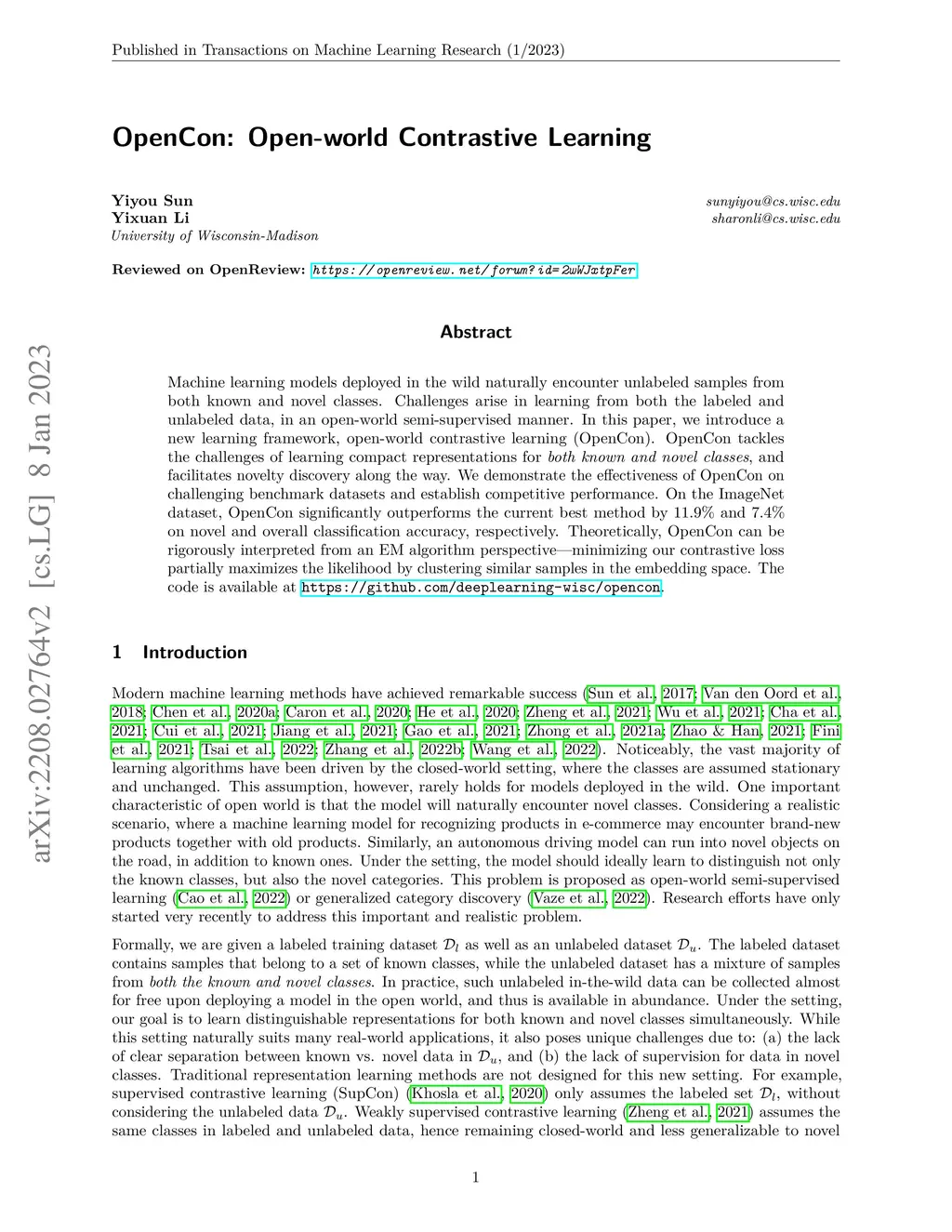 Machine learning models deployed in the wild naturally encounter unlabeled samples from both known and novel classes. Challenges arise in learning from both the labeled and unlabeled data, in an open-world semi-supervised manner. In this paper, we introduce a new learning framework, open-world contrastive learning (OpenCon). OpenCon tackles the challenges of learning compact representations for both known and novel classes and facilitates novelty discovery along the way. We demonstrate the effectiveness of OpenCon on challenging benchmark datasets and establish competitive performance. On the ImageNet dataset, OpenCon significantly outperforms the current best method by 11.9% and 7.4% on novel and overall classification accuracy, respectively. Theoretically, OpenCon can be rigorously interpreted from an EM algorithm perspective--minimizing our contrastive loss partially maximizes the likelihood by clustering similar samples in the embedding space. The code is available at https://github.com/deeplearning-wisc/opencon.