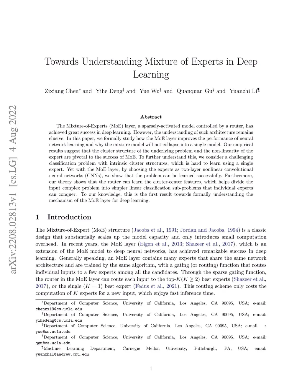 The Mixture-of-Experts (MoE) layer, a sparsely-activated model controlled by a router, has achieved great success in deep learning. However, the understanding of such architecture remains elusive. In this paper, we formally study how the MoE layer improves the performance of neural network learning and why the mixture model will not collapse into a single model. Our empirical results suggest that the cluster structure of the underlying problem and the non-linearity of the expert are pivotal to the success of MoE. To further understand this, we consider a challenging classification problem with intrinsic cluster structures, which is hard to learn using a single expert. Yet with the MoE layer, by choosing the experts as two-layer nonlinear convolutional neural networks (CNNs), we show that the problem can be learned successfully. Furthermore, our theory shows that the router can learn the cluster-center features, which helps divide the input complex problem into simpler linear classification sub-problems that individual experts can conquer. To our knowledge, this is the first result towards formally understanding the mechanism of the MoE layer for deep learning.