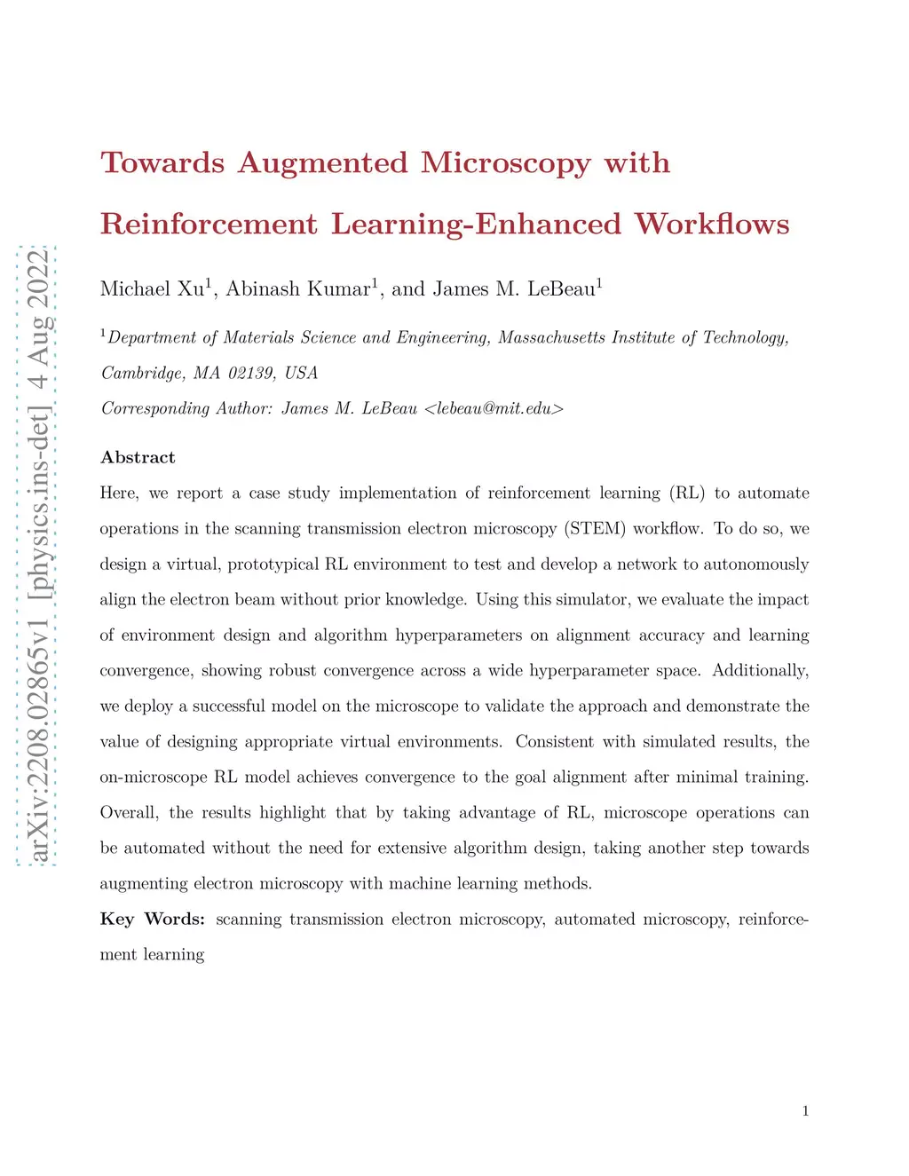 Here, we report a case study implementation of reinforcement learning (RL) to automate operations in the scanning transmission electron microscopy (STEM) workflow. To do so, we design a virtual, prototypical RL environment to test and develop a network to autonomously align the electron beam without prior knowledge. Using this simulator, we evaluate the impact of environment design and algorithm hyperparameters on alignment accuracy and learning convergence, showing robust convergence across a wide hyperparameter space. Additionally, we deploy a successful model on the microscope to validate the approach and demonstrate the value of designing appropriate virtual environments. Consistent with simulated results, the on-microscope RL model achieves convergence to the goal alignment after minimal training. Overall, the results highlight that by taking advantage of RL, microscope operations can be automated without the need for extensive algorithm design, taking another step towards augmenting electron microscopy with machine learning methods.