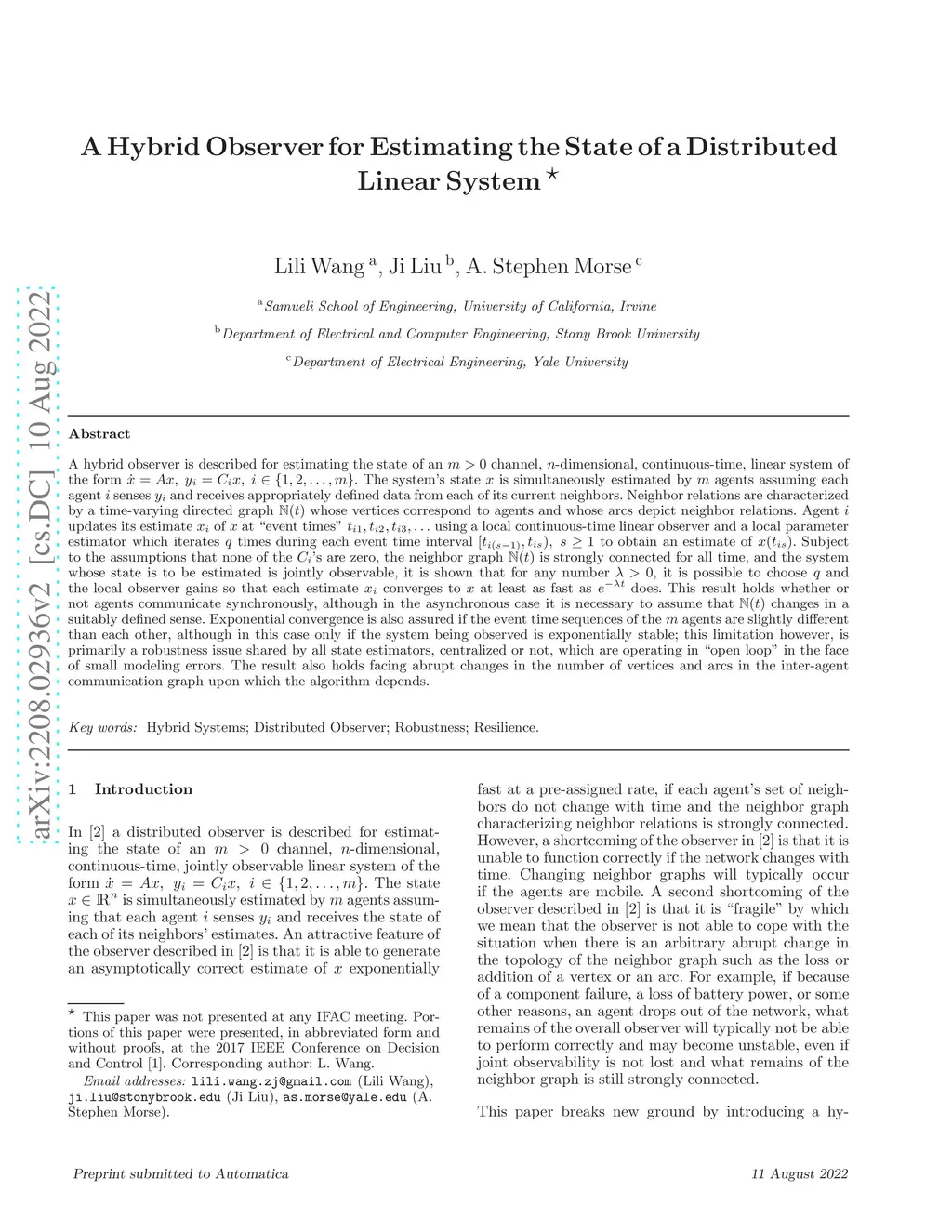 A hybrid observer is described for estimating the state of a system of the form dot x=Ax, y_i=C_ix, i=1,...,m. The system's state x is simultaneously estimated by m agents assuming agent i senses y_i and receives appropriately defined data from its neighbors. Neighbor relations are characterized by a time-varying directed graph N(t). Agent i updates its estimate x_i of x at event times t_{i1},t_{i2} ... using a local continuous-time linear observer and a local parameter estimator which iterates q times during each event time interval [t_{i(s-1)},t_{is}), s>=1, to obtain an estimate of x(t_{is}). Subject to the assumptions that N(t) is strongly connected, and the system is jointly observable, it is possible to design parameters so that x_i converges to x with a pre-assigned rate. This result holds when agents communicate asynchronously with the assumption that N(t) changes slowly. Exponential convergence is also assured if the event time sequence of the agents are slightly different, although only if the system being observed is exponentially stable; this limitation however, is a robustness issue shared by all open loop state estimators with small modeling errors. The result also holds facing abrupt changes in the number of vertices and arcs in the inter-agent communication graph upon which the algorithm depends.