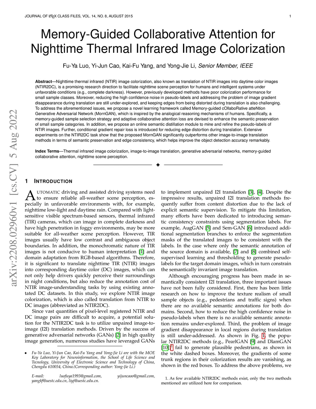 Nighttime thermal infrared (NTIR) image colorization, also known as translation of NTIR images into daytime color images (NTIR2DC), is a promising research direction to facilitate nighttime scene perception for humans and intelligent systems under unfavorable conditions (e.g., complete darkness). However, previously developed methods have poor colorization performance for small sample classes. Moreover, reducing the high confidence noise in pseudo-labels and addressing the problem of image gradient disappearance during translation are still under-explored, and keeping edges from being distorted during translation is also challenging. To address the aforementioned issues, we propose a novel learning framework called Memory-guided cOllaboRative atteNtion Generative Adversarial Network (MornGAN), which is inspired by the analogical reasoning mechanisms of humans. Specifically, a memory-guided sample selection strategy and adaptive collaborative attention loss are devised to enhance the semantic preservation of small sample categories. In addition, we propose an online semantic distillation module to mine and refine the pseudo-labels of NTIR images. Further, conditional gradient repair loss is introduced for reducing edge distortion during translation. Extensive experiments on the NTIR2DC task show that the proposed MornGAN significantly outperforms other image-to-image translation methods in terms of semantic preservation and edge consistency, which helps improve the object detection accuracy remarkably.