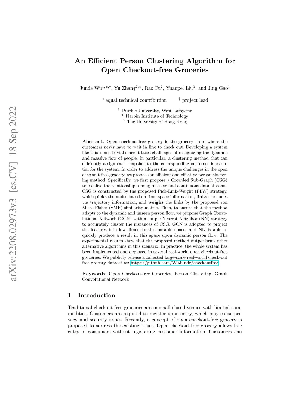 Open checkout-free grocery is the grocery store where the customers never have to wait in line to check out. Developing a system like this is not trivial since it faces challenges of recognizing the dynamic and massive flow of people. In particular, a clustering method that can efficiently assign each snapshot to the corresponding customer is essential for the system. In order to address the unique challenges in the open checkout-free grocery, we propose an efficient and effective person clustering method. Specifically, we first propose a Crowded Sub-Graph (CSG) to localize the relationship among massive and continuous data streams. CSG is constructed by the proposed Pick-Link-Weight (PLW) strategy, which \textbf{picks} the nodes based on time-space information, \textbf{links} the nodes via trajectory information, and \textbf{weighs} the links by the proposed von Mises-Fisher (vMF) similarity metric. Then, to ensure that the method adapts to the dynamic and unseen person flow, we propose Graph Convolutional Network (GCN) with a simple Nearest Neighbor (NN) strategy to accurately cluster the instances of CSG. GCN is adopted to project the features into low-dimensional separable space, and NN is able to quickly produce a result in this space upon dynamic person flow. The experimental results show that the proposed method outperforms other alternative algorithms in this scenario. In practice, the whole system has been implemented and deployed in several real-world open checkout-free groceries.