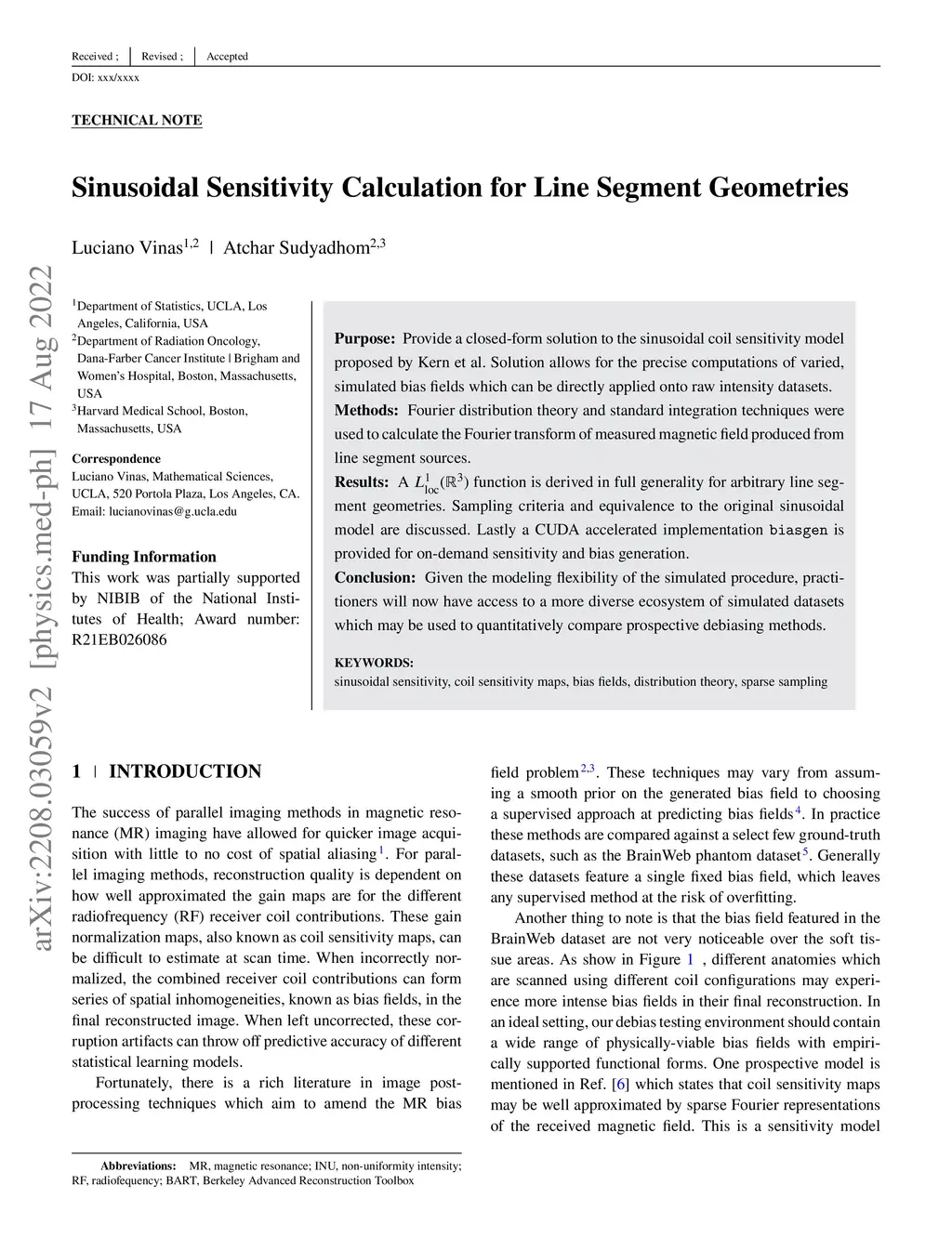 Purpose: Provide a closed-form solution to the sinusoidal coil sensitivity model proposed by Kern et al. Solution allows for the precise computations of varied, simulated bias fields which can be directly applied onto raw intensity datasets. Methods: Fourier distribution theory and standard integration techniques were used to calculate the Fourier transform of measured magnetic field produced from line segment sources. Results: A function is derived in full generality for arbitrary line segment geometries. Sampling criteria and equivalence to the original sinusoidal model are discussed. Lastly a CUDA accelerated implementation is provided for on-demand sensitivity and bias generation. Conclusion: Given the modeling flexibility of the simulated procedure, practitioners will now have access to a more diverse ecosystem of simulated datasets which may be used to quantitatively compare prospective debiasing methods.