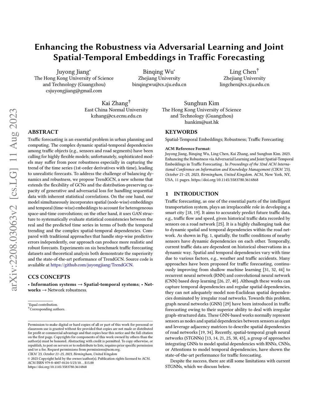 Traffic forecasting is an essential problem in urban planning and computing. The complex dynamic spatial-temporal dependencies among traffic objects (e.g., sensors and road segments) have been calling for highly flexible models; unfortunately, sophisticated models may suffer from poor robustness especially in capturing the trend of the time series (1st-order derivatives with time), leading to unrealistic forecasts. To address the challenge of balancing dynamics and robustness, we propose TrendGCN, a new scheme that extends the flexibility of GCNs and the distribution-preserving capacity of generative and adversarial loss for handling sequential data with inherent statistical correlations. On the one hand, our model simultaneously incorporates spatial (node-wise) embeddings and temporal (time-wise) embeddings to account for heterogeneous space-and-time convolutions; on the other hand, it uses GAN structure to systematically evaluate statistical consistencies between the real and the predicted time series in terms of both the temporal trending and the complex spatial-temporal dependencies. Compared with traditional approaches that handle step-wise predictive errors independently, our approach can produce more realistic and robust forecasts. Experiments on six benchmark traffic forecasting datasets and theoretical analysis both demonstrate the superiority and the state-of-the-art performance of TrendGCN. Source code is available at https://github.com/juyongjiang/TrendGCN.
