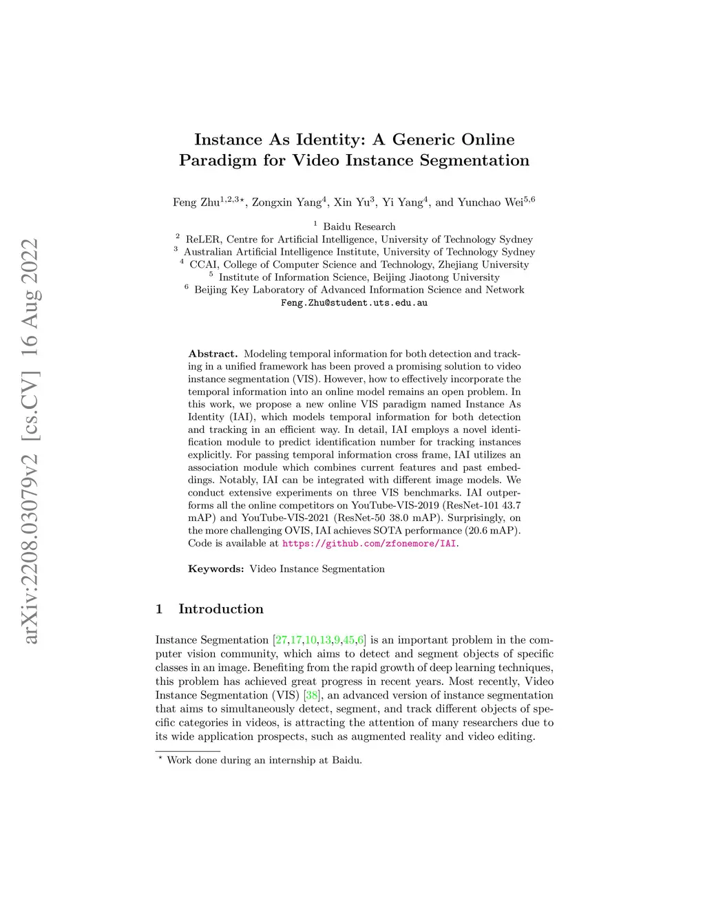 Modeling temporal information for both detection and tracking in a unified framework has been proved a promising solution to video instance segmentation (VIS). However, how to effectively incorporate the temporal information into an online model remains an open problem. In this work, we propose a new online VIS paradigm named Instance As Identity (IAI), which models temporal information for both detection and tracking in an efficient way. In detail, IAI employs a novel identification module to predict identification number for tracking instances explicitly. For passing temporal information cross frame, IAI utilizes an association module which combines current features and past embeddings. Notably, IAI can be integrated with different image models. We conduct extensive experiments on three VIS benchmarks. IAI outperforms all the online competitors on YouTube-VIS-2019 (ResNet-101 43.7 mAP) and YouTube-VIS-2021 (ResNet-50 38.0 mAP). Surprisingly, on the more challenging OVIS, IAI achieves SOTA performance (20.6 mAP). Code is available at https://github.com/zfonemore/IAI