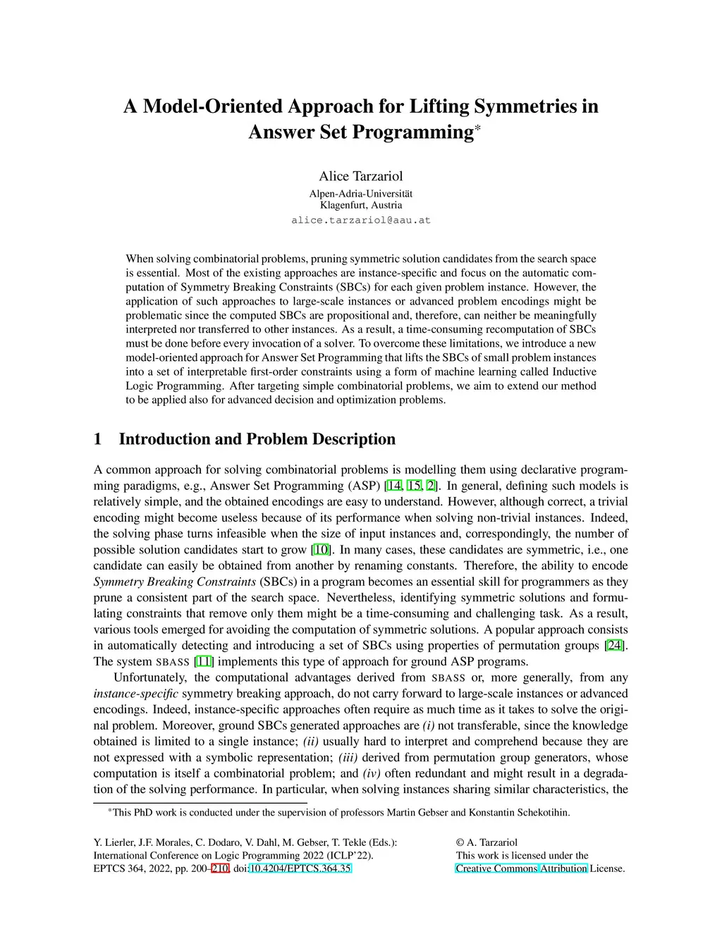 When solving combinatorial problems, pruning symmetric solution candidates from the search space is essential. Most of the existing approaches are instance-specific and focus on the automatic computation of Symmetry Breaking Constraints (SBCs) for each given problem instance. However, the application of such approaches to large-scale instances or advanced problem encodings might be problematic since the computed SBCs are propositional and, therefore, can neither be meaningfully interpreted nor transferred to other instances. As a result, a time-consuming recomputation of SBCs must be done before every invocation of a solver. To overcome these limitations, we introduce a new model-oriented approach for Answer Set Programming that lifts the SBCs of small problem instances into a set of interpretable first-order constraints using a form of machine learning called Inductive Logic Programming. After targeting simple combinatorial problems, we aim to extend our method to be applied also for advanced decision and optimization problems.