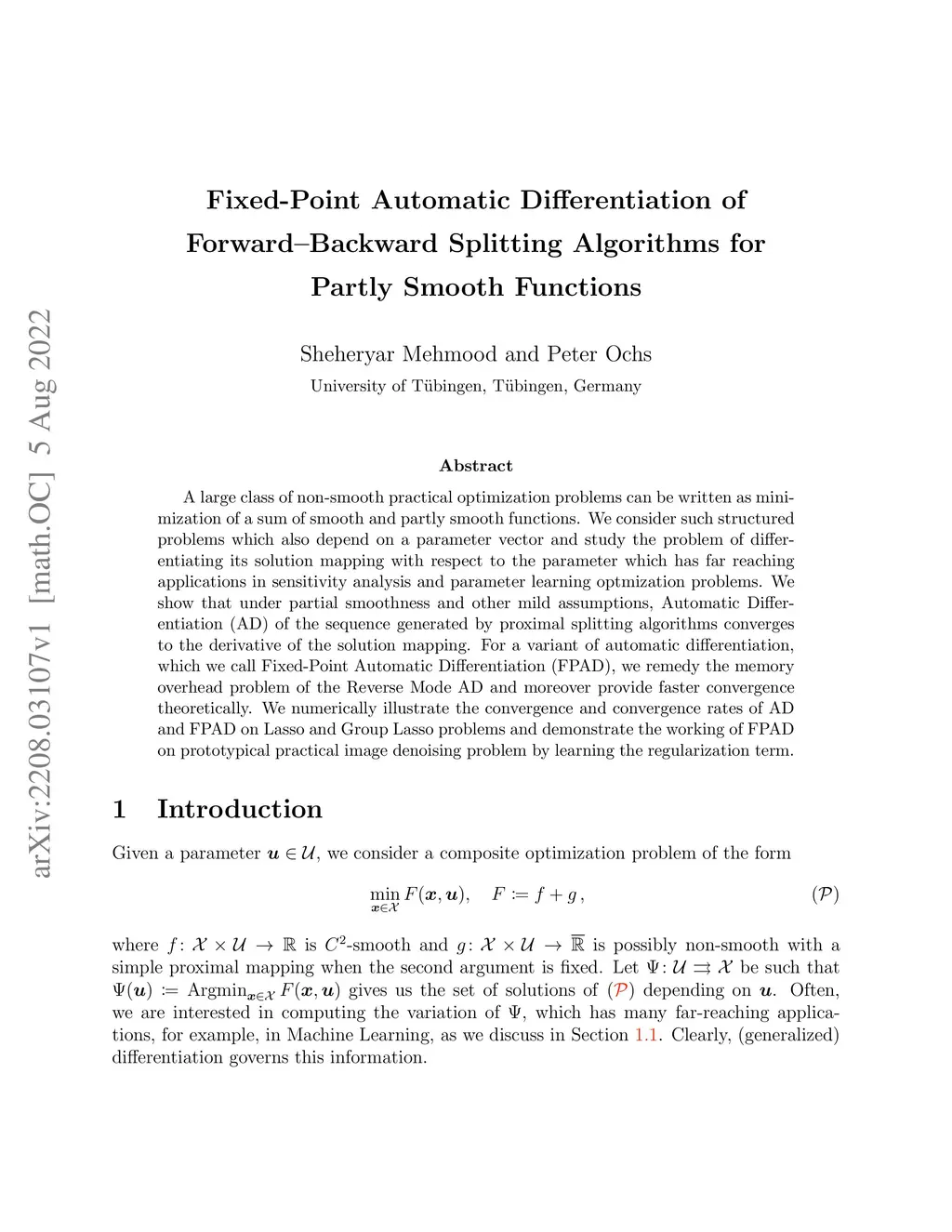 A large class of non-smooth practical optimization problems can be written as minimization of a sum of smooth and partly smooth functions. We consider such structured problems which also depend on a parameter vector and study the problem of differentiating its solution mapping with respect to the parameter which has far reaching applications in sensitivity analysis and parameter learning optmization problems. We show that under partial smoothness and other mild assumptions, Automatic Differentiation (AD) of the sequence generated by proximal splitting algorithms converges to the derivative of the solution mapping. For a variant of automatic differentiation, which we call Fixed-Point Automatic Differentiation (FPAD), we remedy the memory overhead problem of the Reverse Mode AD and moreover provide faster convergence theoretically. We numerically illustrate the convergence and convergence rates of AD and FPAD on Lasso and Group Lasso problems and demonstrate the working of FPAD on prototypical practical image denoising problem by learning the regularization term.